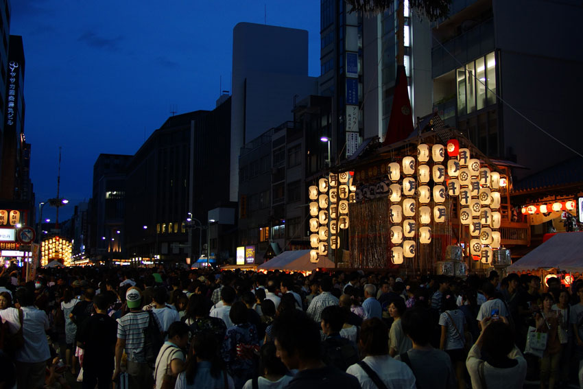 In the evenings before the main processions (yoiyama), the yamahoko are decorated with paper lanterns