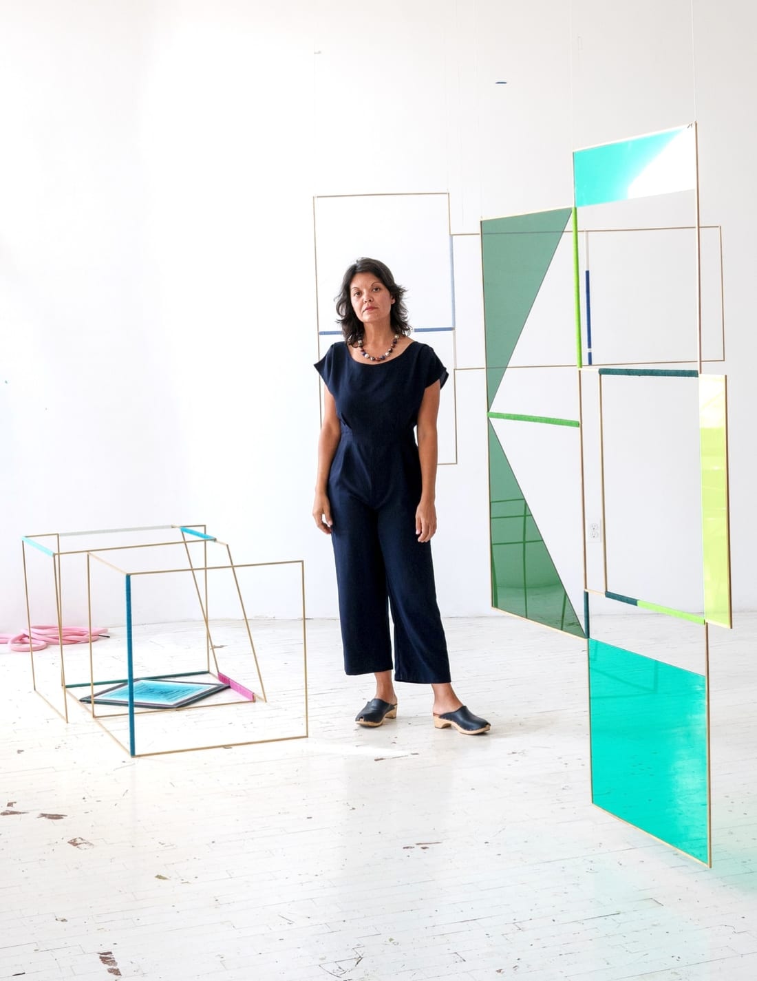 With two brass bracelets dangling from her wrists, Mexican artist Claudia Peña Salinas flips through her well-worn scrapbook. She points to illustrations based on The Tale of the Genji. She pulls out square samples of Plexiglas and snippets of cotton thread dyed with textile ink in varying shades of green and blue.