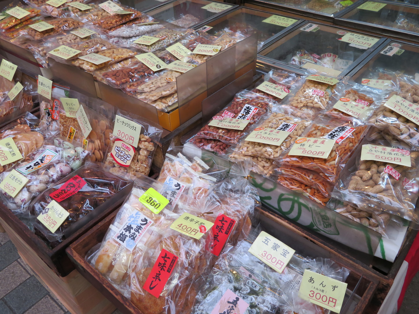 To get the shitamachi feel, start from Keikyu Kamata Station. Asuto is one of Kamata’s many covered shotengai, but with a slightly narrower street that creates a feeling of coziness. Just near the entrance of Asuto, look for Tajimaya, a traditional shitamachi shop selling peanut, bean, and rice cracker snacks. Yoshida-san, the shop’s third-generation owner, bulk buys his stock and then seals the goodies into cellophane packets in his backroom before putting them on sale. Much of Tajimaya’s stock is displayed in traditional wooden cases with glass tops, transporting visitors back in time to the postwar years when the shop was first opened.