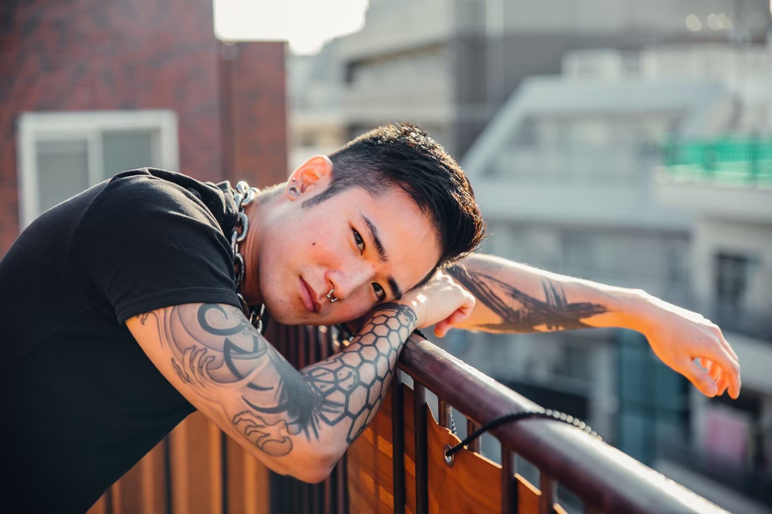 French-born porn star Axel Abysse typically blends in when in Japan. He keeps his undercut shaved and his beard trimmed. He wears sports tank tops and shorts to fight the summer heat. Only his large cartilage piercings hint at a more alternative lifestyle.
