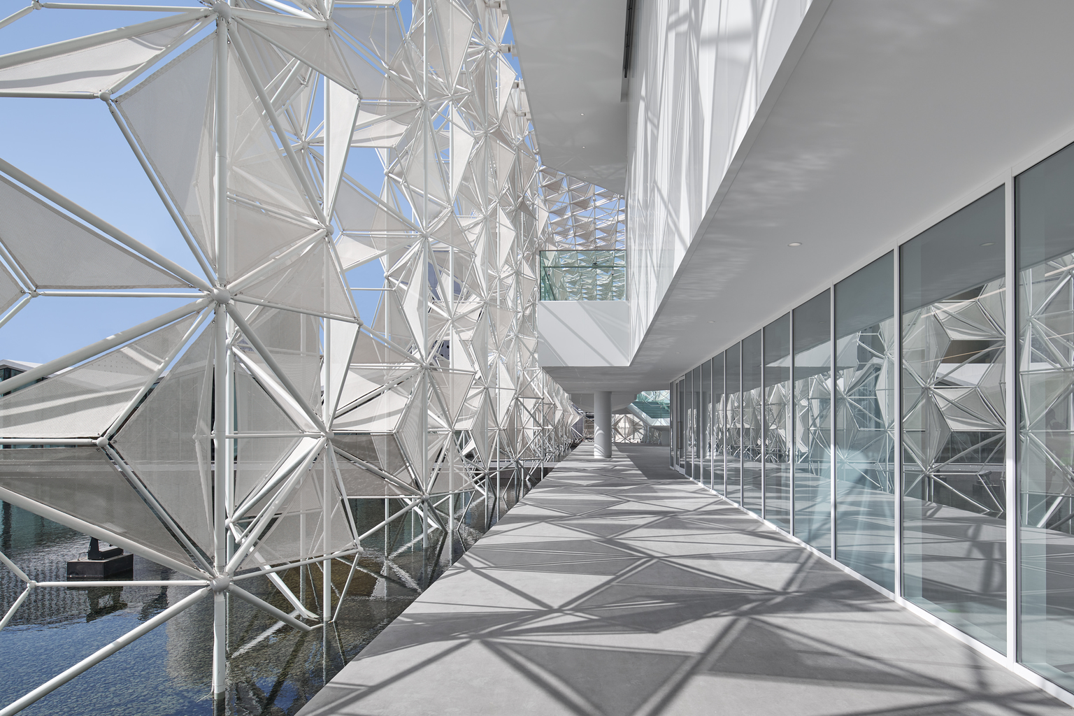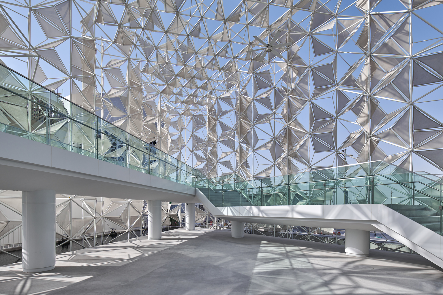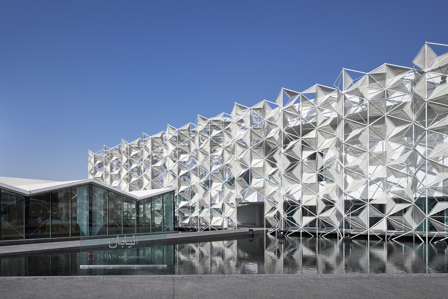 The white origami-like façade of the building was designed by Yuko Nagayama. Perceiving the similarities between traditional Arabesque Middle Eastern and Japanese Asanoha geometrical patterns, she created a new kind of geometrical 3D lattice serving as the structure and environmental filter. “Based on the expo’s theme of ‘connecting,’ I conceived the theme of the architecture in particular as two types of connections: the cultural connection and the technological connection between Japan and the Middle East,” Nagayama states.