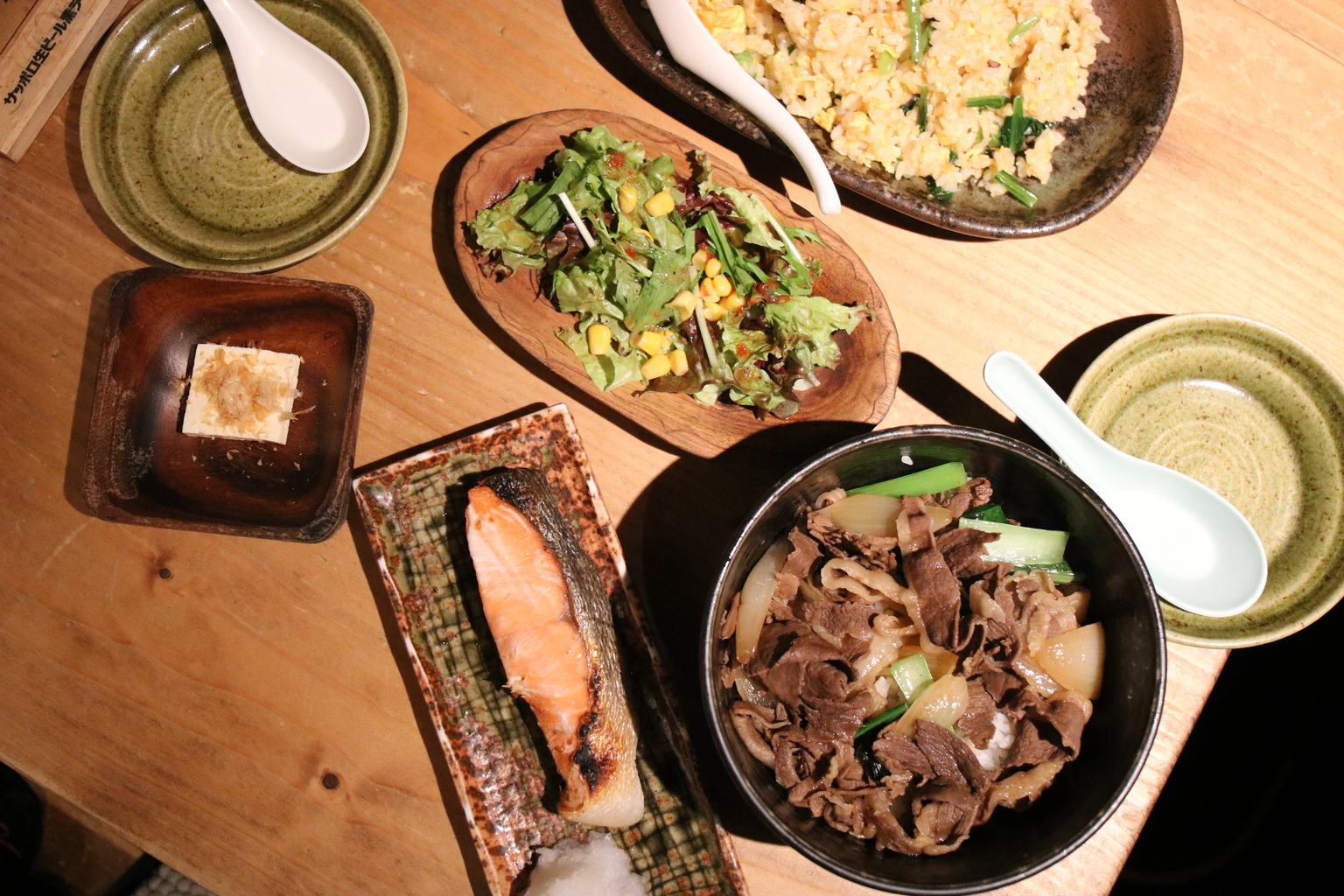 Grilled salmon, deer meat rice bowl and kitopiro garlic chahan fried rice