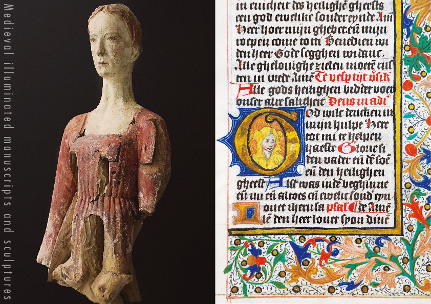 Sometimes the pages are enlivened by mythical beasts and crawling plants. The medieval works are joined by the anthropomorphic, wooden “statue carvings” of contemporary artist Hideki Maekawa. His somber, humanoid figures, with their individualized expression and dress, each seem to have a story. As we look at Maekawa’s works and the manuscripts together, we are invited to complete the story and ask the question: what were the lives of the manuscript readers really like?
