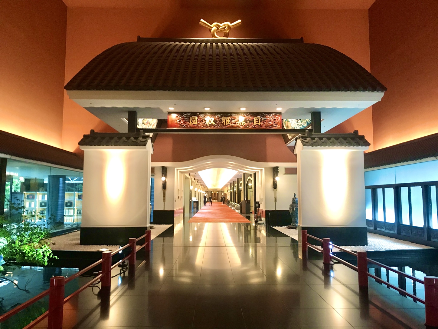 Finally, you can view the captivating “Welcome Gate” or Daimon, with a ridge-decorated copper roof designed by Kyu Suzuki. The gate is adorned with lacquer glass fittings and colored wood carvings of a dragon and a tiger. This corridor leads to the spacious and modern Pandora Café lounge, surrounded by Japanese-tiled overhangs for every floor. Pretty fan silhouettes also shine on the interior balconies.