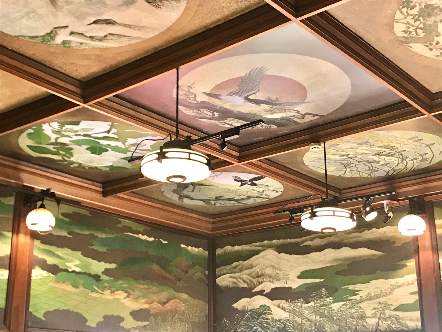 Gajoen’s entrance leads to a long corridor of huge, colorful wood-carved panels depicting Edo life. The left side of the pathway is lined with red Japanese-styled guard rails, a pond and wood-carved panels on the wall by artists Chikuha Otake and Horei Sakari. They depict twenty-one Japanese scenic sights. On the right side are traditional Mikoshi (portable shrines) and an antique ceramic jar. The ceilings reveal charming paintings of women in kimonos, ornamental fans and flora.