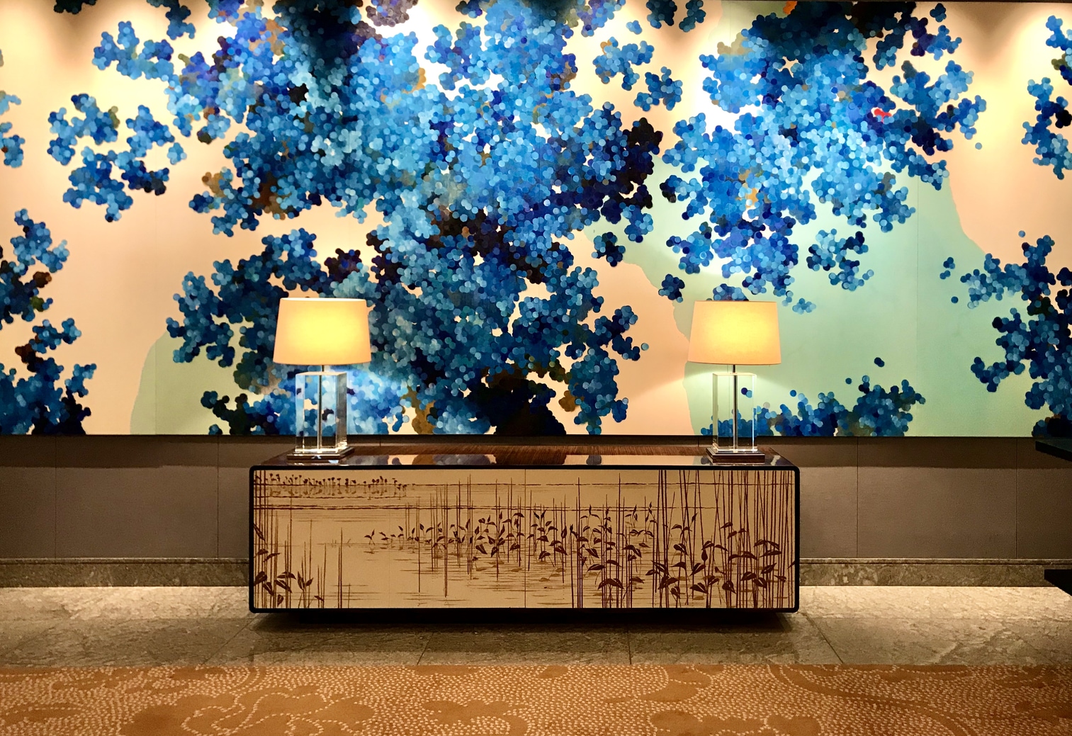 One of the most striking pieces is an oil painting of vibrant blue petals, Shikisai no Shita by Satoshi Uchiumi on the second floor. In the meeting rooms of the fourth floor, Fumie Hiratai’s serene sky vision, Amatsukaze and Aki Yamamoto’s Chirality, a multi-layered expression of nature’s reflection on the moat surrounding the nearby Imperial Palace, are utterly engaging. The spectacular views of the palace grounds against Tokyo’s skyline blend perfectly with the hotel’s sophisticated art, truly embodying the richness of Japanese culture.
