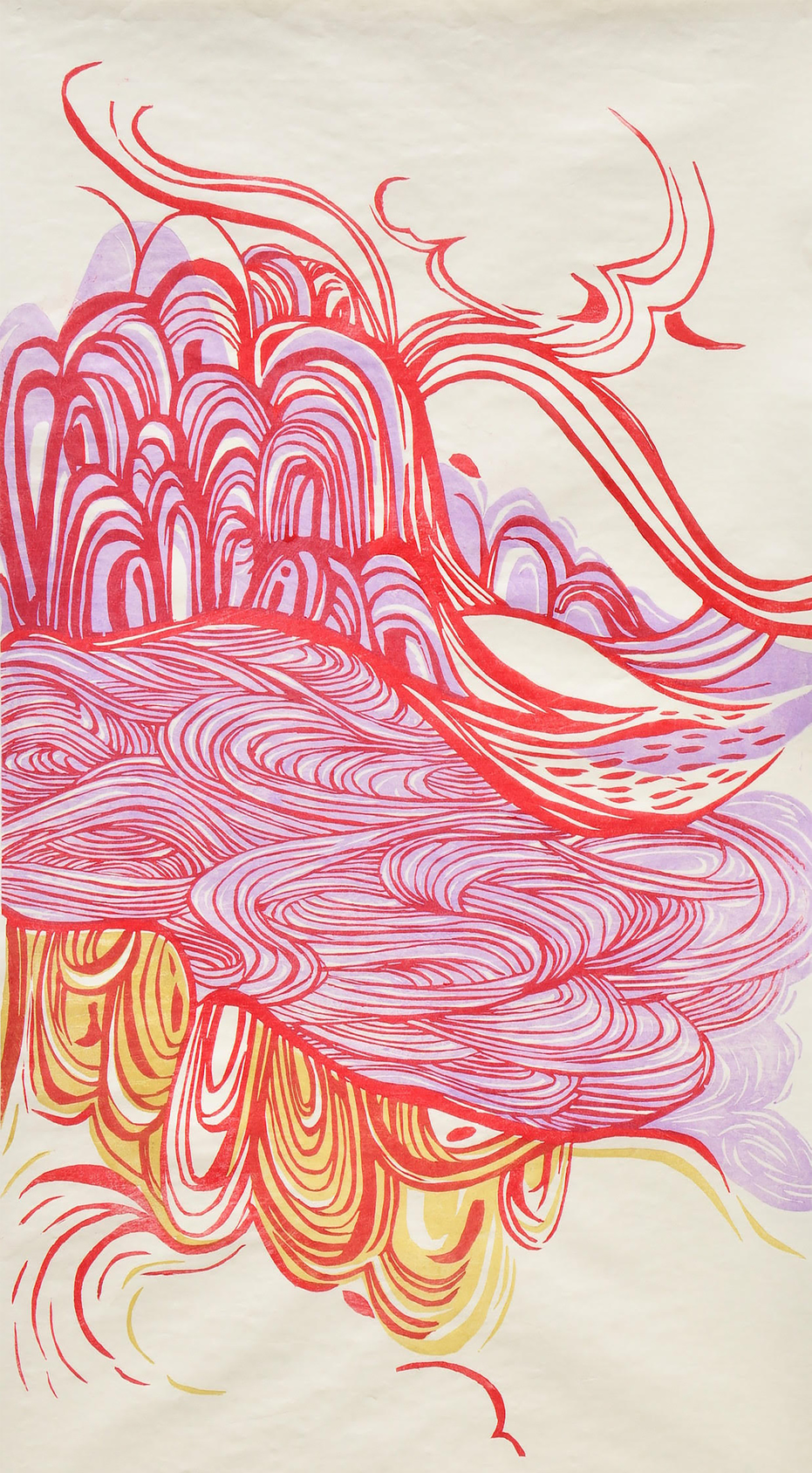 Glad you asked. Mokuhanga is a traditional printing technique once used commercially in Japan to mass produce images such as Katsushika Hokusai’s famous “The Great Wave off Kanagawa.” The multi-step process begins with the carving of wooden blocks. Any areas of the image where color should not appear must be cut away from the block, resulting in something that looks like a wooden stamp. The artist then rubs color into the wood and presses the paper onto the surface which, when removed, reveals the carved image. Whilst the art has a rich history, it is now being recognized for having unique characteristics that are appealing to modern artists around the world.