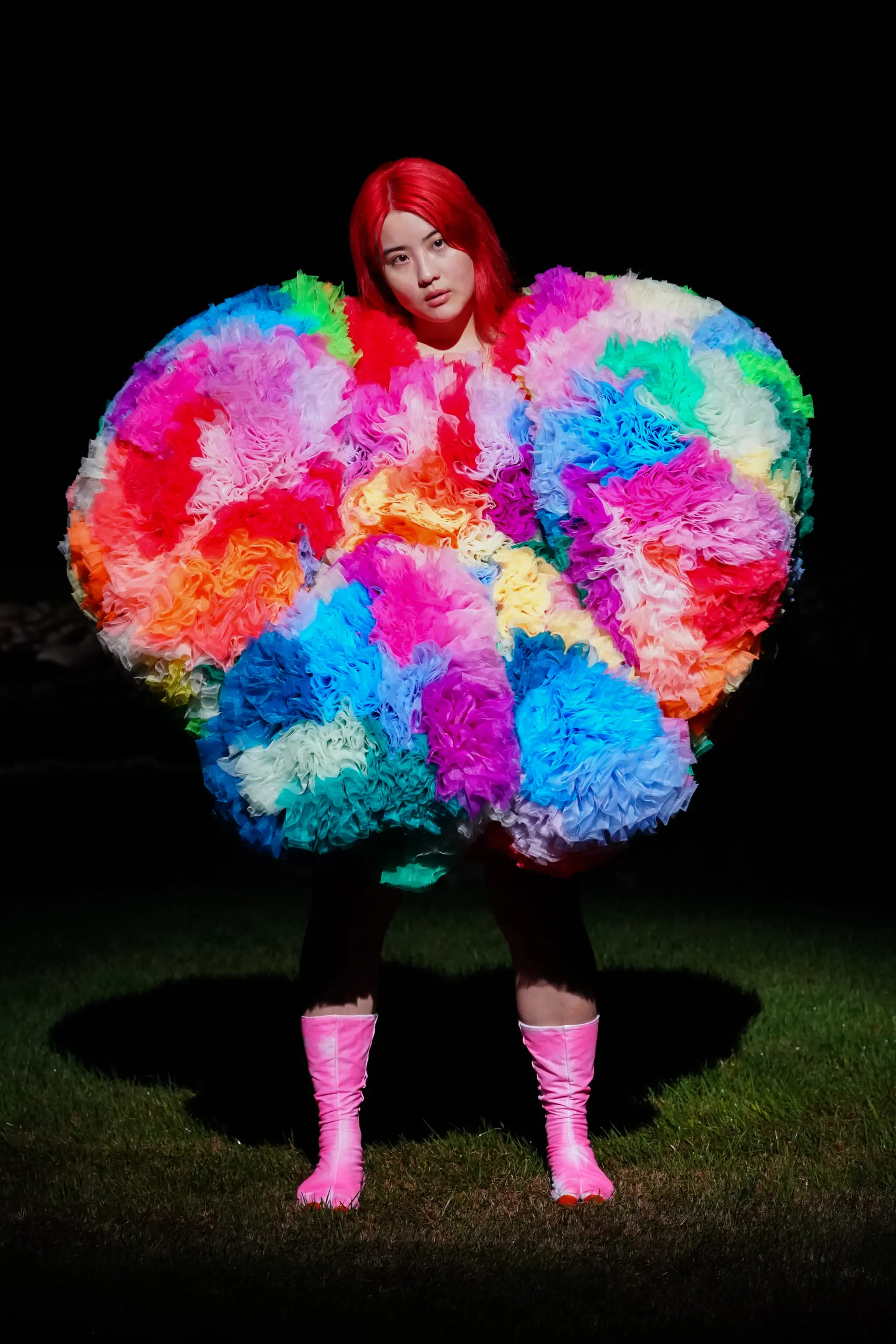 The Tokyo-based designer shouts from Tokyo to the world, and has done so since 2019 when he was plucked from Instagram by the influential stylist Katie Grand. In a whirlwind three weeks, he went from Japanese costume designer to international celebrity dresser via his show, arranged by Grand, at New York Fashion Week. His first ever show outside Japan featured the likes of actor and essayist Emily Ratakojwski and models Bella Hadid and Joan Smalls. Since then, Koizumi has gone on to dress the biggest names in showbiz.