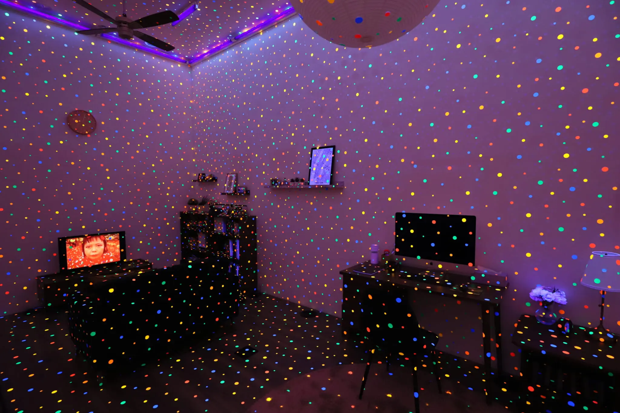 Kusama first developed hexagonal mirror and electric light pieces in the 1960s. She poignantly revisits this concept in this 2023 piece. Peeking into holes, viewers discover an infinite expanse of reflections, identities merging into a psychedelic landscape to become part of Kusama’s cosmic kaleidoscope. In this piece, Kusama honors each and every wish for peace thereby not devaluing the individual in the act of dissolution, instead advancing a transcendent universal interconnectedness. The repetitive fragments of self create a sense of infinity and dissolution. Faces become a dazzling shared happening that only the participants can witness as they become integral to a shared, mysterious, grand design. The experience is a reward for willing to peek into the unknown. Through these captivating experiences, the first floor prepares the viewer to embark on a transformative journey of the artist’s ongoing pursuit of self-obliteration.