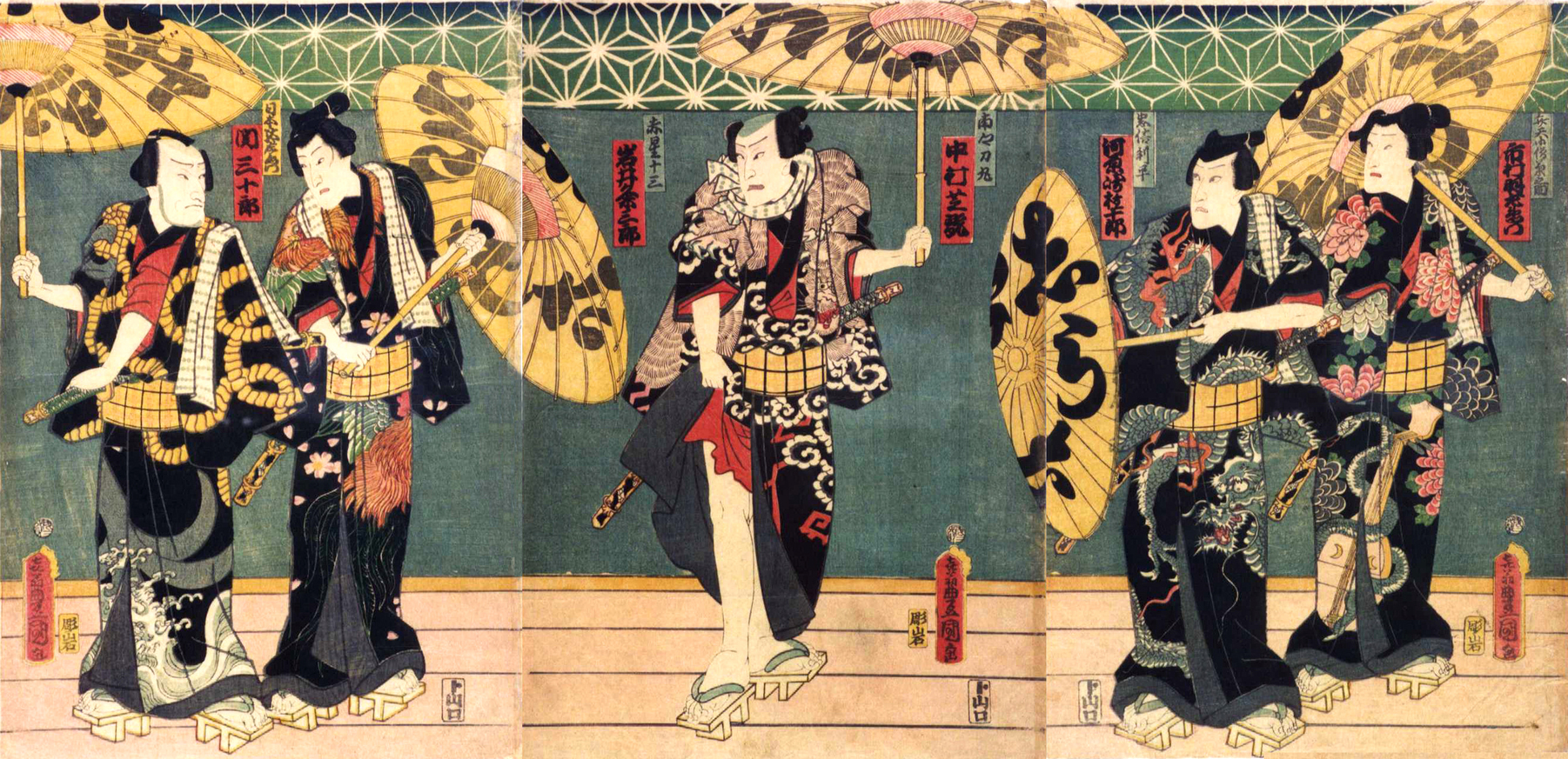 A print by Utagawa Kunisada depicting the kabuki play Shiranami Gonin Otoko (The Story of Five Notorious Thieves). Image from Wikimedia Commons.