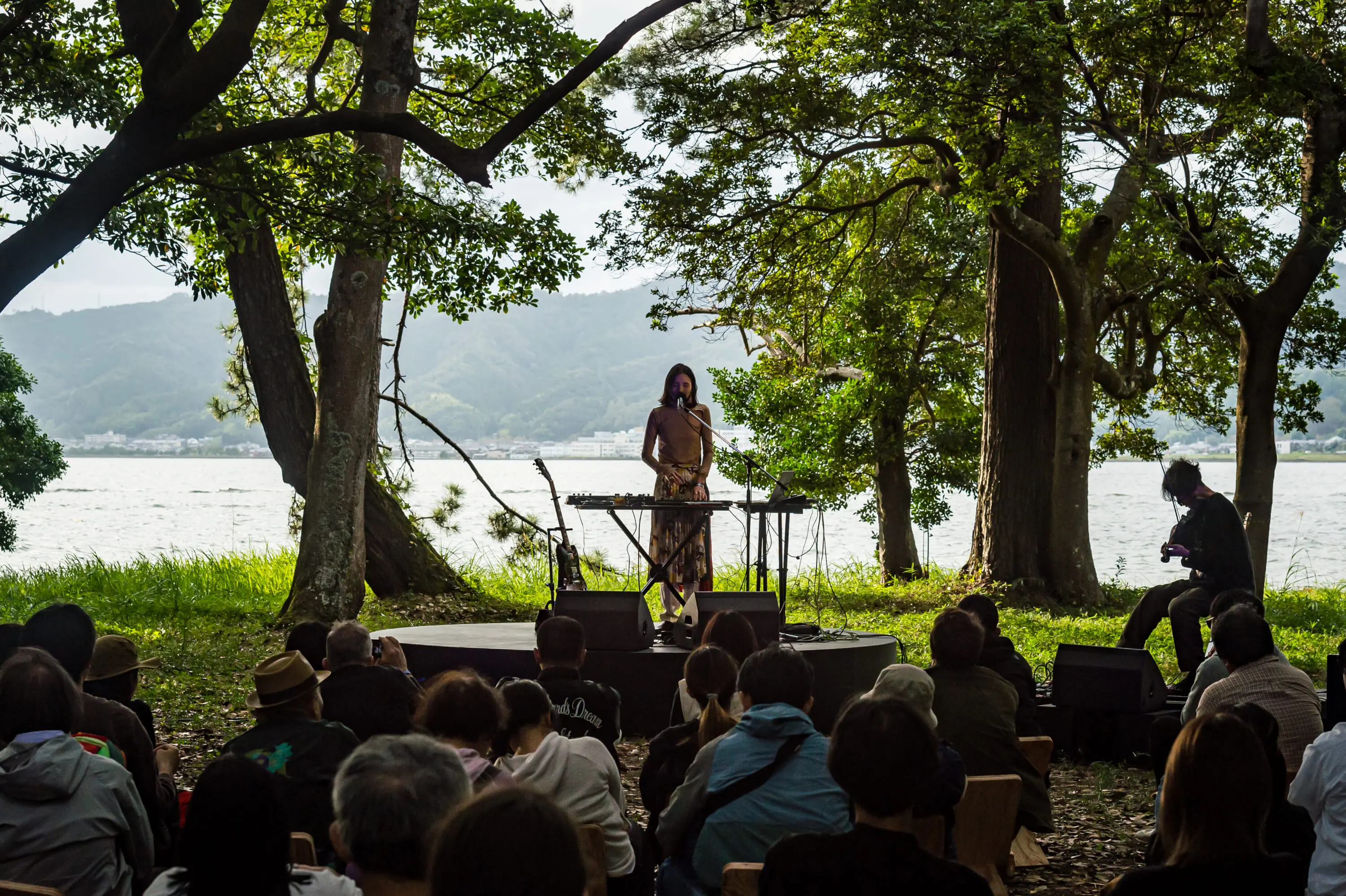 Guests were welcomed into the scenic location with an ukidaiko drumming performance, an intangible folk cultural property of Miyazu, a city in Kyoto Prefecture. The Beach Stage opened with the radiant Kavka Shishido directing Japan’s leading drummers and percussionists into an improvised frolic of rhythm. The audience radiated joy and energy listening and reacting with their whole bodies. It was hard to resist the draw of the dynamic beats.