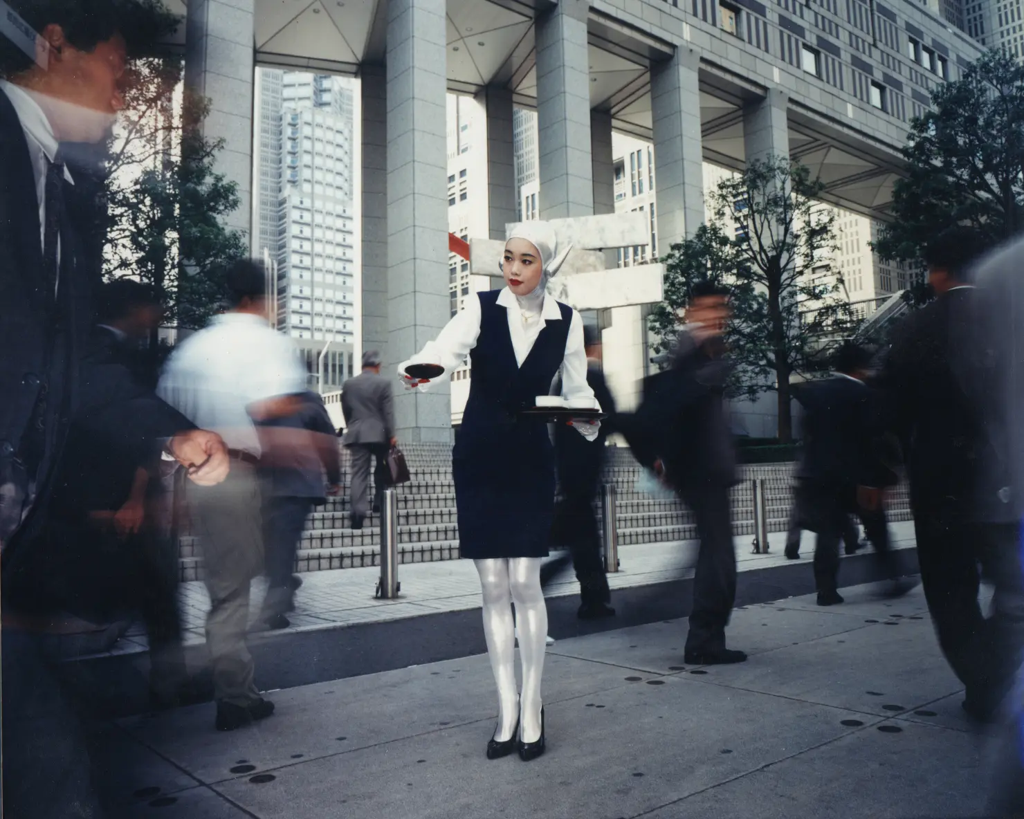 In the series, she cosplayed as an alien serving tea — in one photograph to no one and in another, surrounded by disinterested salarymen — in protest against these gender ideals. She became the buzz of the scene and continued the series until the mid-’90s. Since then, each of Mori’s phases has been revered by fans and insiders alike.