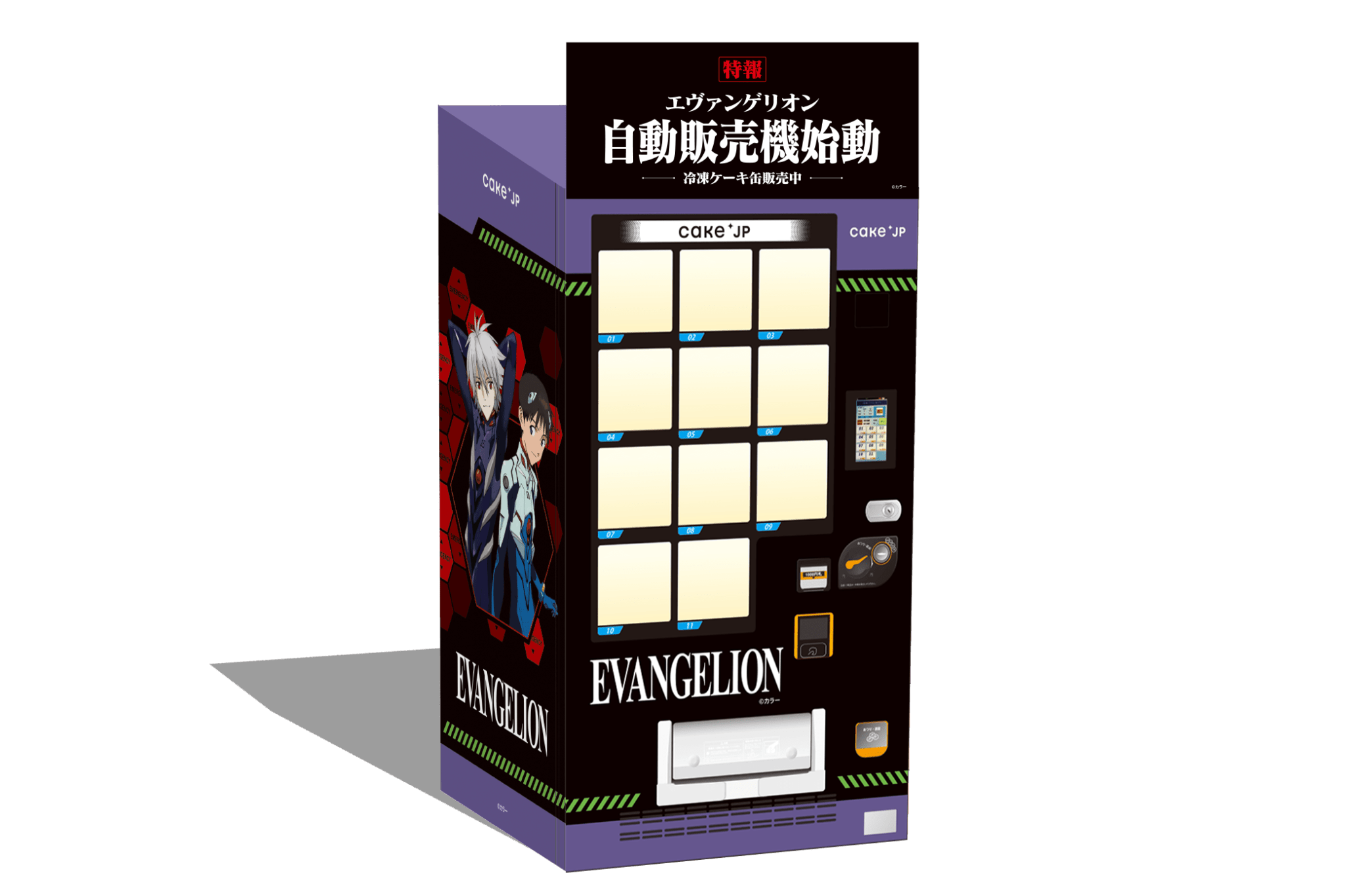 Cake.jp is bringing its Evangelion desserts closer to fans with its own cake-selling robots — vending machines. In July 2023, the first dedicated Evangelion cake vending machine was placed at Terminal 2 of Tokyo International Airport (Haneda). The placement is thought out and aimed at overseas visitors, to give them a sweet surprise as soon as they arrive in Tokyo. The vending machine itself is designed to be a good photo spot too. This machine stocks the three main Evangelion characters, plus Kaworu Nagisa, a side character from Evangelion 2.