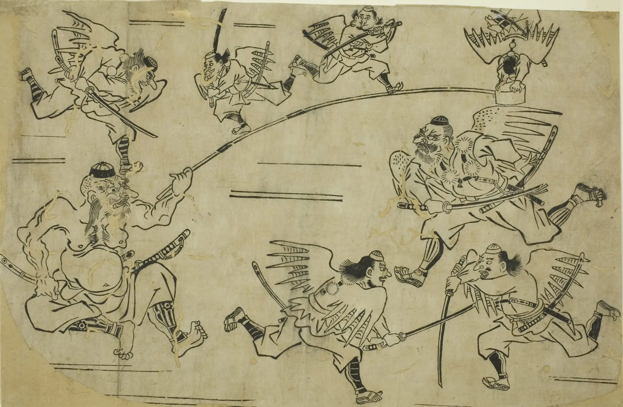Woodblock print artwork depicting the Tengu King training several tengu (Source: Wikimedia Commons)