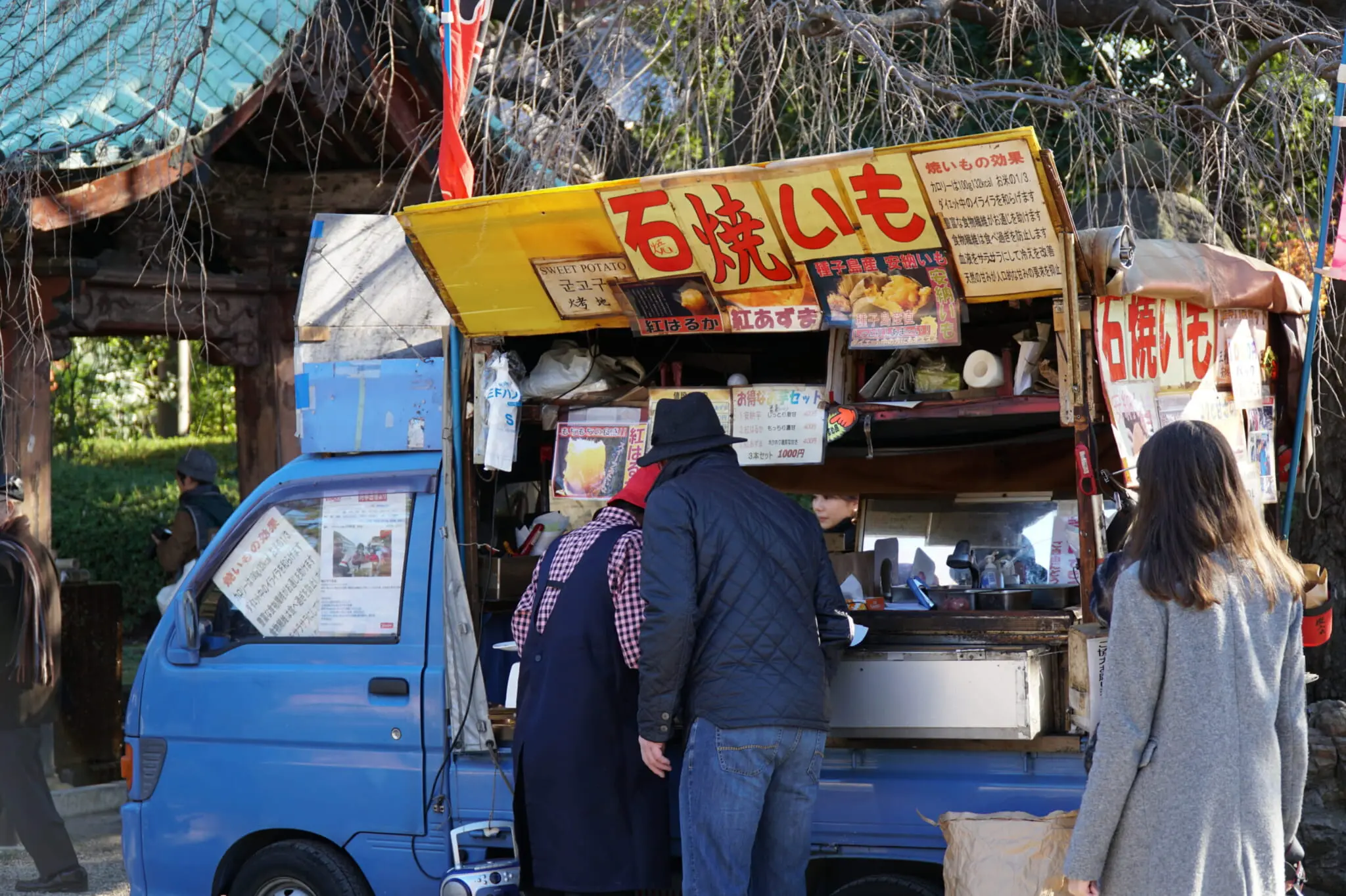 Your local baked sweet-potato vendor drives around in a cart each evening come dusk. The van belts out the potato song: “ishi-yaki-imoooo” through the loudspeakers, ready to greet the rosy cheeks that wait. They park outside shopping malls or stations where lines duly form. Join it, and enjoy the patter of the yaki-imo man as he sells his goodies, often with free samples to lure anyone still on the fence.
