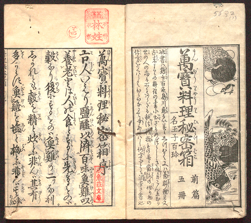 To flick through the pages of the 1785 cookbook Secret Treasure Chest of Ten-Thousand Recipes, go to http://kotenseki.nijl.ac.jp/biblio/100249426/viewer/1 or browse the web-friendly version of the recipes (in Japanese) at http://codh.rois.ac.jp/edo-cooking/