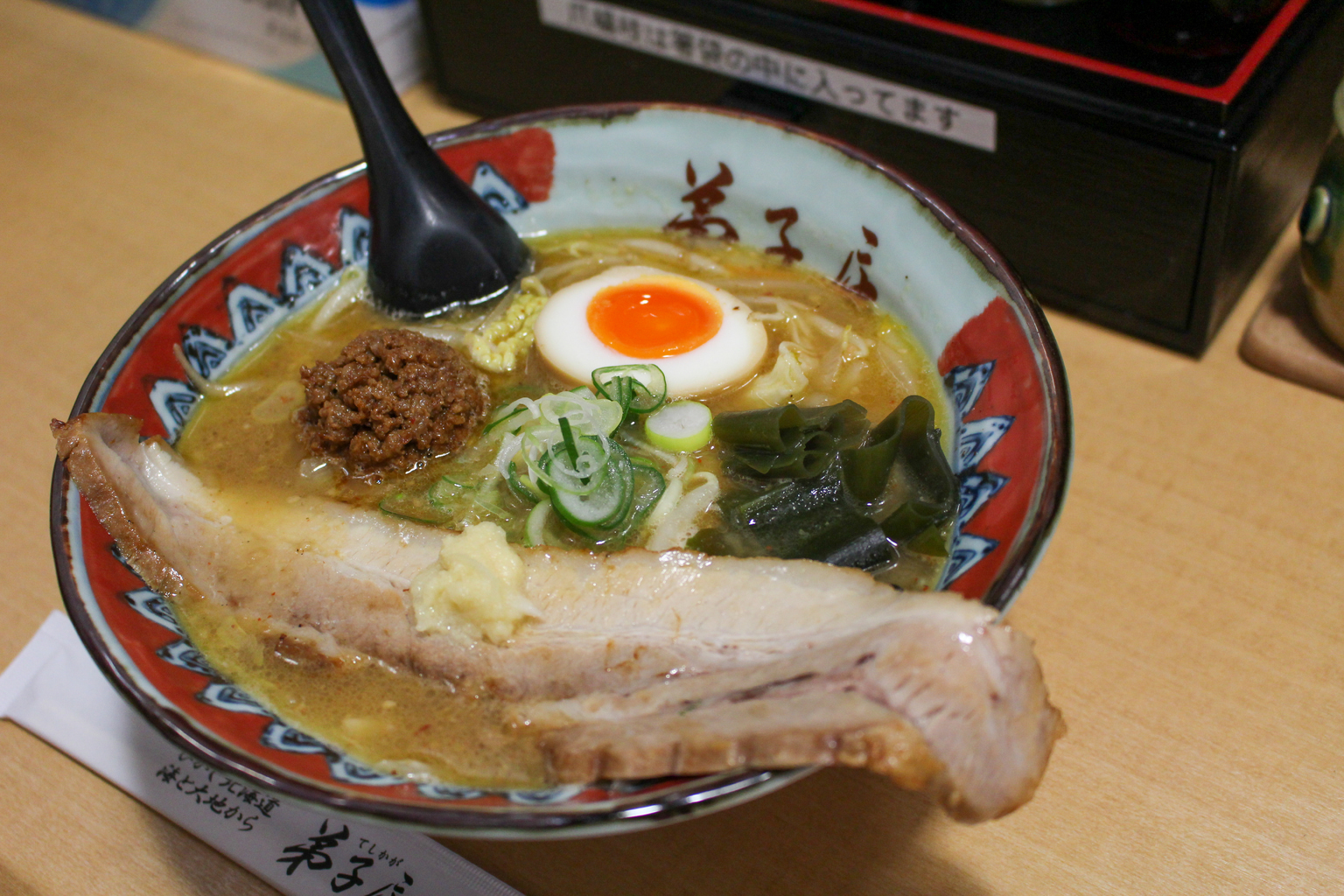 One of the most popular shops in Ganso Ramen Yokocho is Teshikaga Ramen. Here, there is an emphasis on using Hokkaido-based ingredients such as pigs raised near Teshikaga or scallops from the Sea of Okhotsk. The miso ramen is made using a tonkotsu broth base that has been bubbling away for over 20 hours. It’s topped with a char siu that’s been grilled to order over a shichirin grill, accompanied by ground beef and miso mix, wakame, marinated egg, green onions and a small knob of grated ginger finishing the bowl.