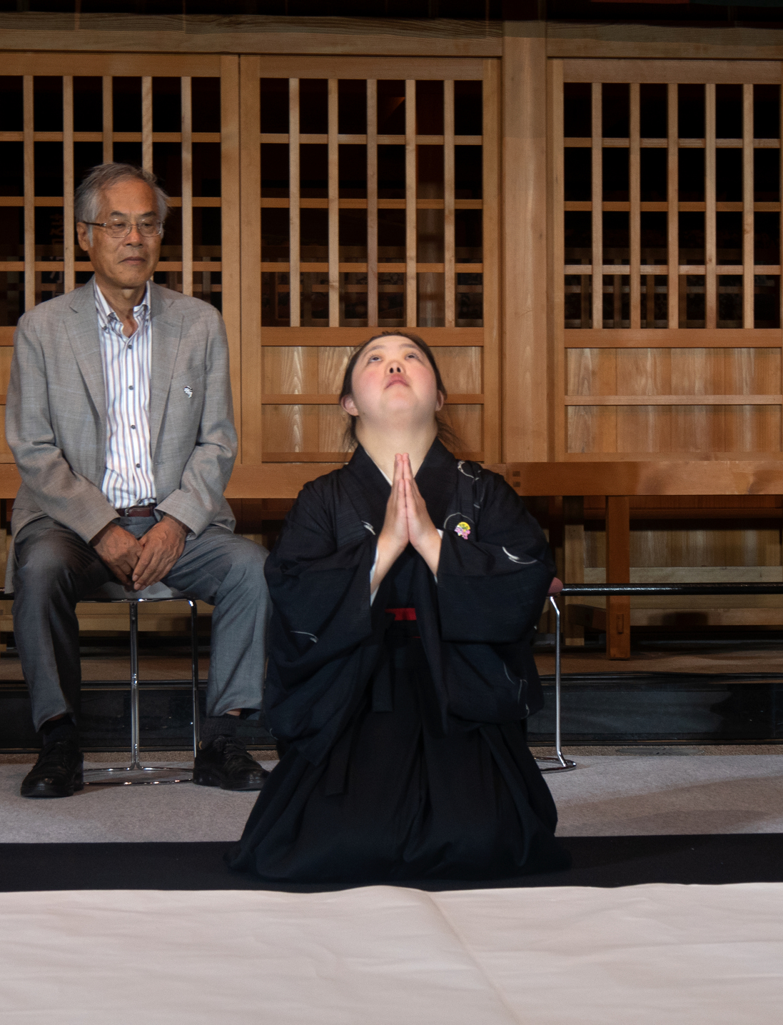 Shoko Kanazawa prepares to begin calligraphy performance on Aug 7, 2018 at the Edo-Tokyo Museum.