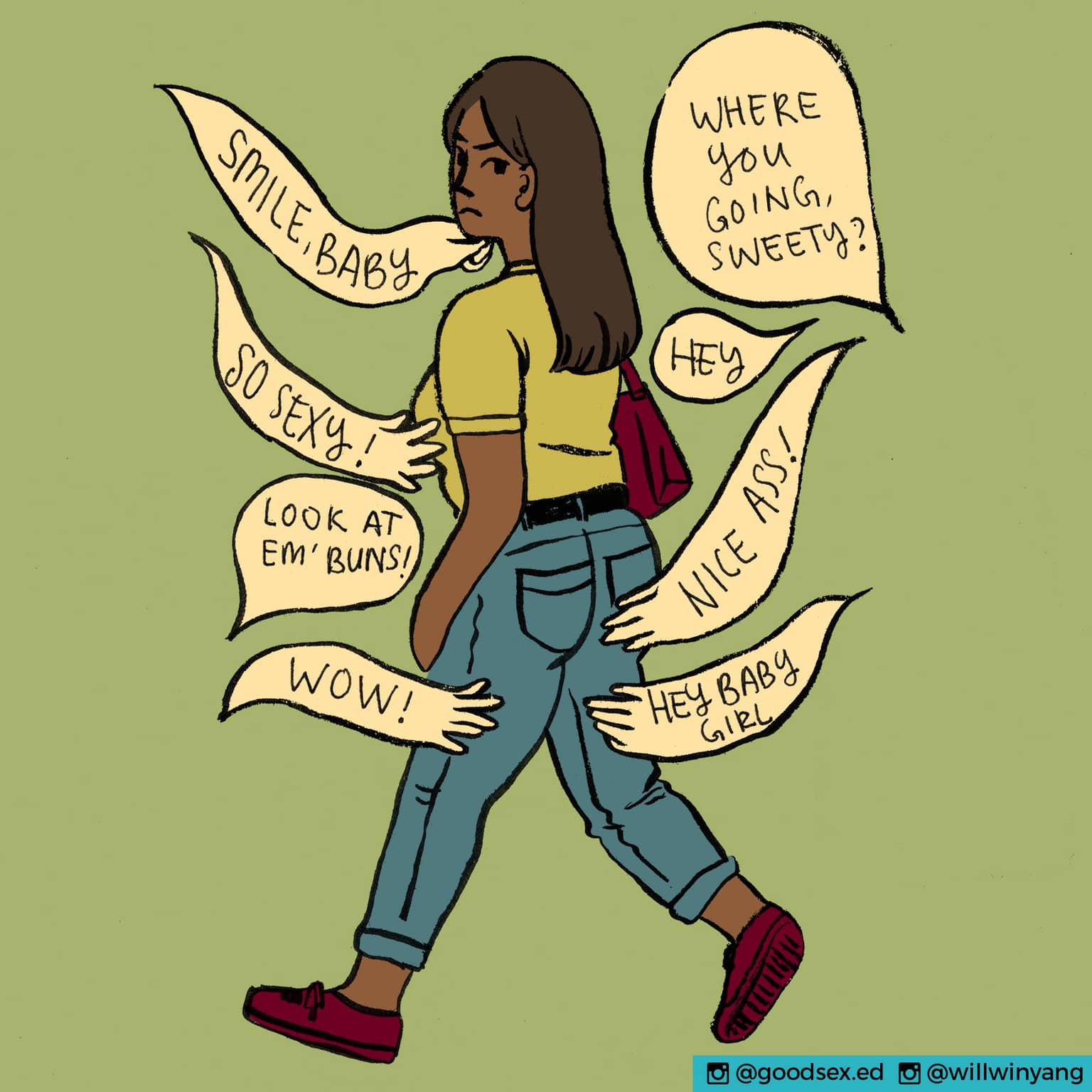 From June Low’s Facebook page: “Brought to you by Willwin Yang, an illustrator based in Kuala Lumpur, she encapsulates the essence of getting catcalled on the street with her art. Catcalling is not a compliment and rather, it makes the individual feel unsafe. From a young age, women are taught to act and behave a certain way to avoid attention from men. We think that men should be educated from a young age not to objectify women and to treat them with respect!”