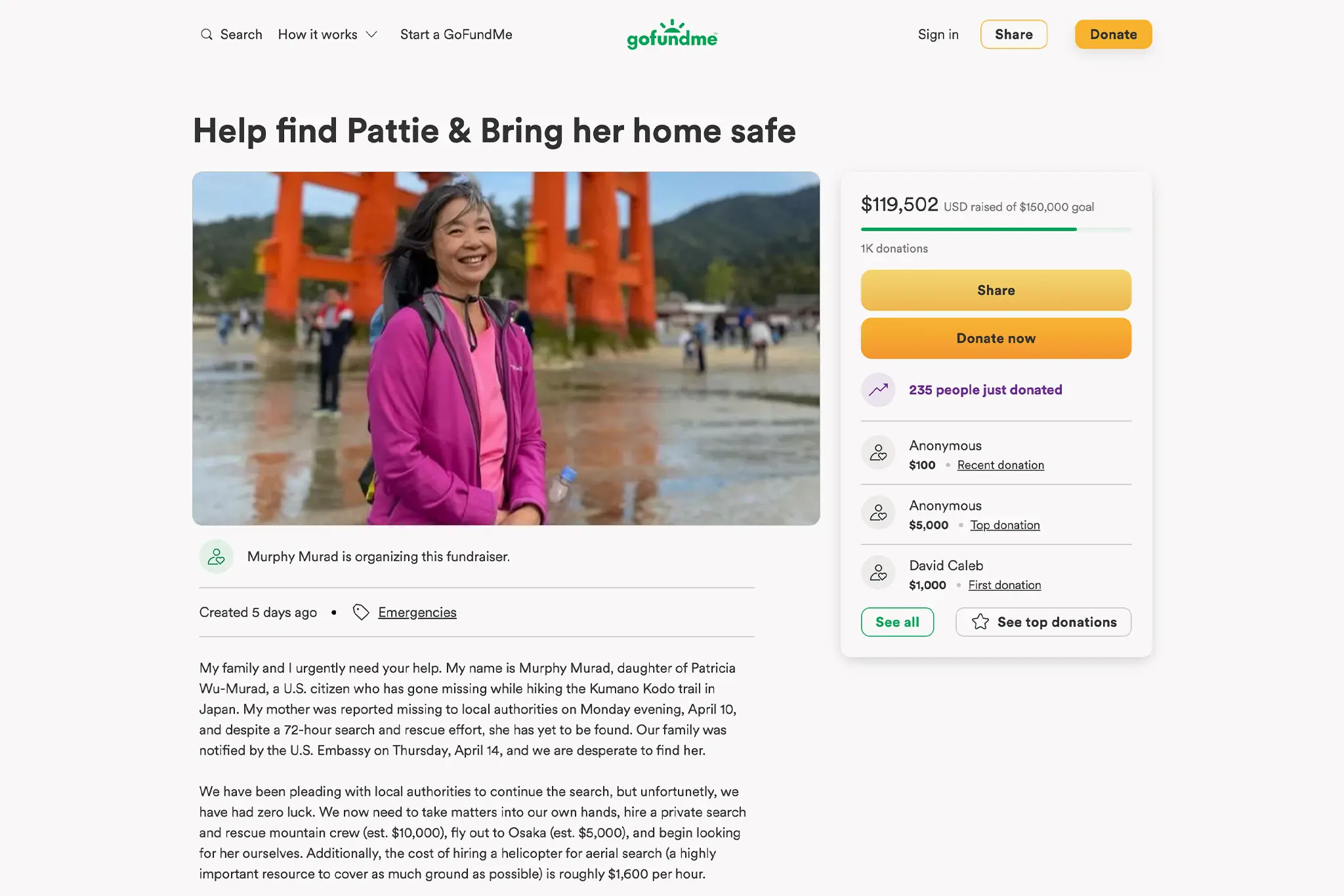 It’s been more than 10 days since Patricia Wu-Murad, 61, disappeared during a hiking pilgrimage along the Kumano Kodo trail. The Connecticut mother of three was last seen leaving a guesthouse on the morning of April 10. After she failed to show up at the hostel that evening, staff called the police to report her missing. A 72-hour search ended on April 13. Her family was only informed about the situation a day later. They were reportedly told that local authorities were “reluctant to restart the search because they didn’t have any leads” and had “limited resources over the weekends.”