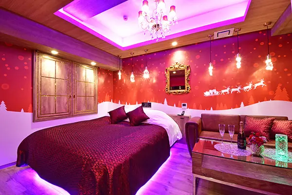 The Sara Grande in Gotanda has it all. For couples who are up for a bit of roleplay, you can do worse than find a room at this inn. No matter your kink, Sara Grande probably has it, including a fake gym, complete with weights, called The Fitness. There’s also The School roleplay room, featuring classroom desks. And of course, Christmas is no exception. The My Lover is Santa Claus room will have you jingling bells into the new year, as you have a merry rest on the red bed, while admiring the jolly Santa scene on the wall.