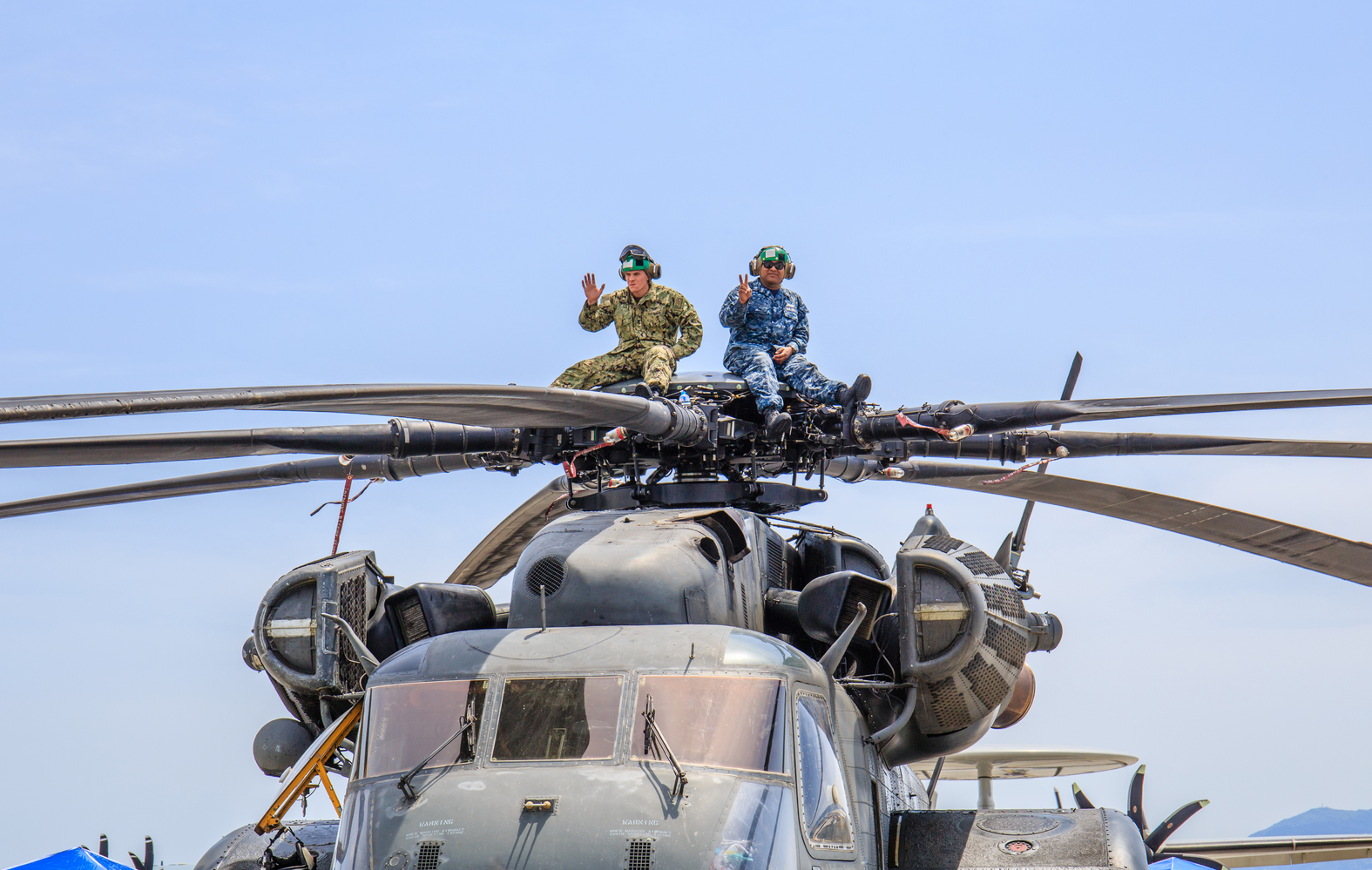 The pilots are sitting on top of their U.S. Marine Corps CH-53E Super Stallion helicopter at a U.S. base on Japan-U.S. Friendship Day, a free event open to the public. (Source: WorldStock/Shutterstock)