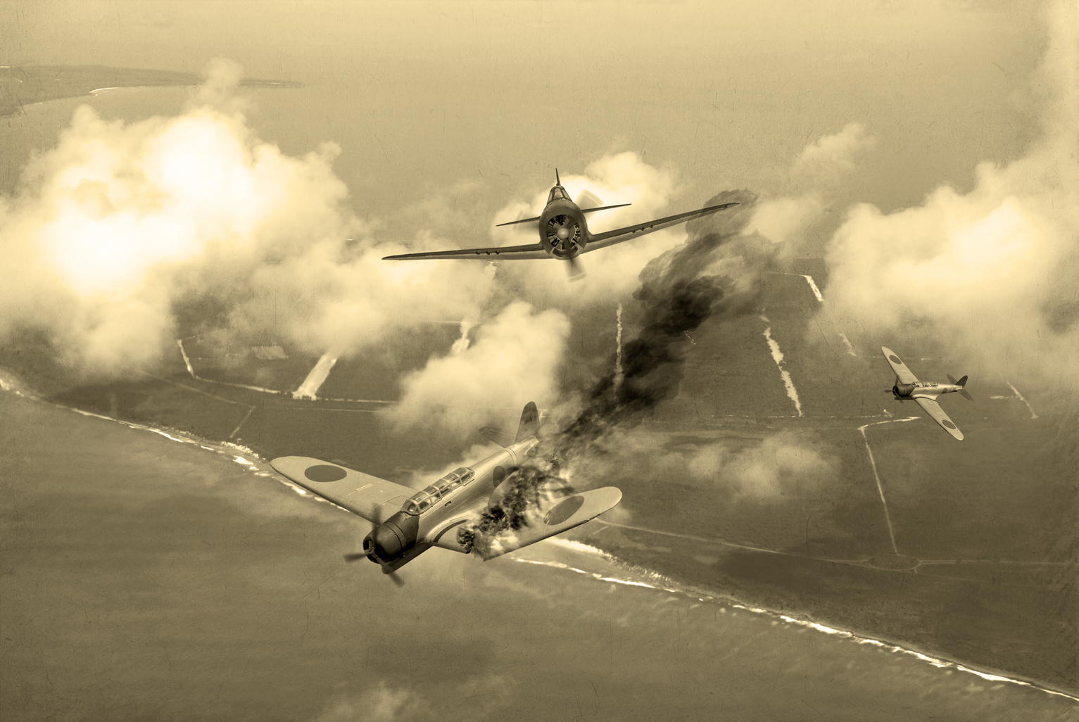 ‘Vintage Style’ image of a World War 2 US fighter plane shooting down Japanese torpedo bomber over Saipan. (Source: Shutterstock)