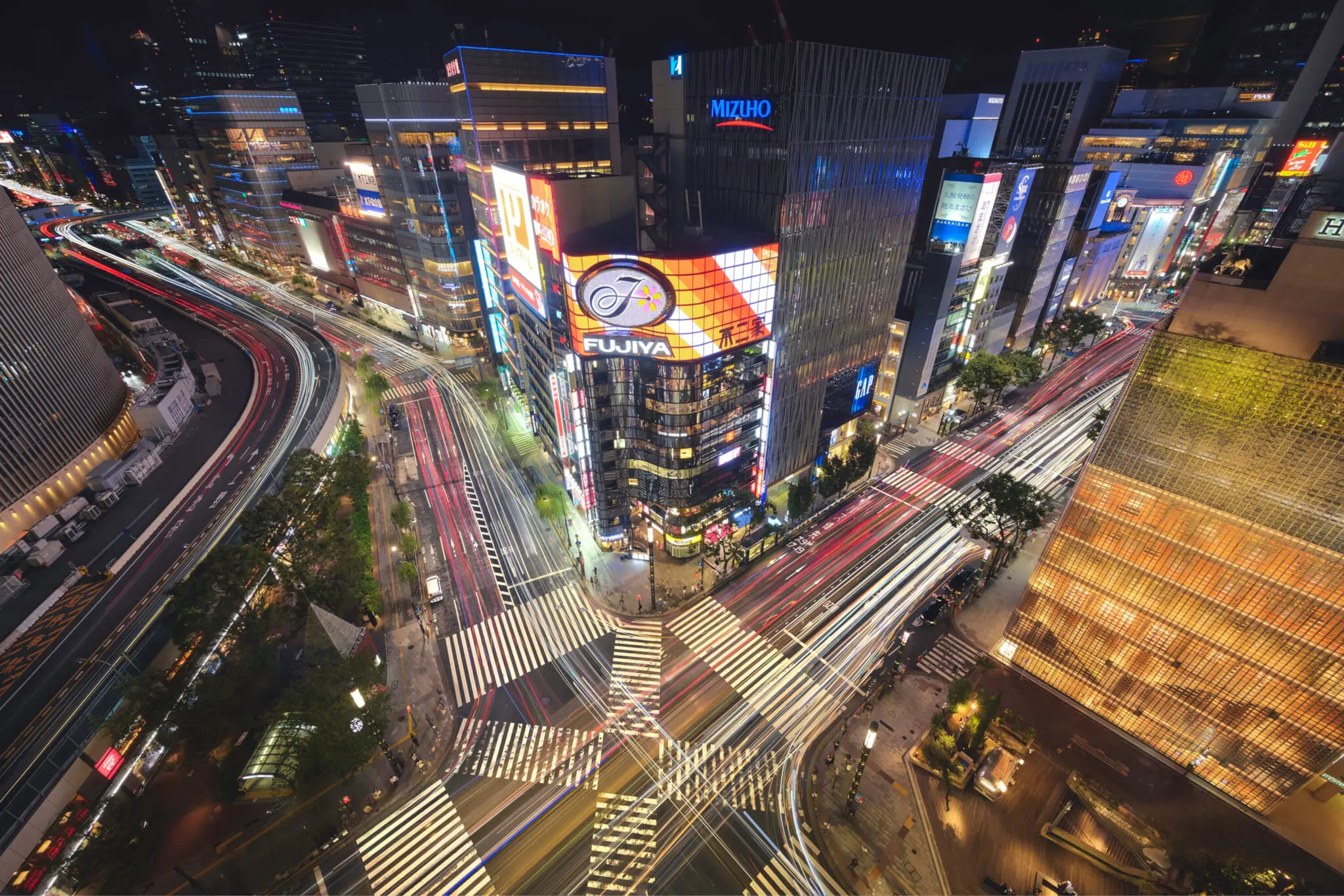 Deeper into the Ginza neighborhood, you’ll find another crossing that leaves a lasting impression. At the crossroads of the Seiko headquarters — officially named Seiko House Ginza — this crossing embodies the luxe and feel of Tokyo’s twist on New York City’s Fifth Avenue. This single location provides fantastic views of architectural trends and styles. Even if you’re just window shopping here, you’ll see just how vast Japan’s crafts are. In one corner, you’ve got Seiko’s precise wristwatches. On the other side of the crossing, you’ve got Nissan’s latest cars and a fully-equipped Sony showroom.