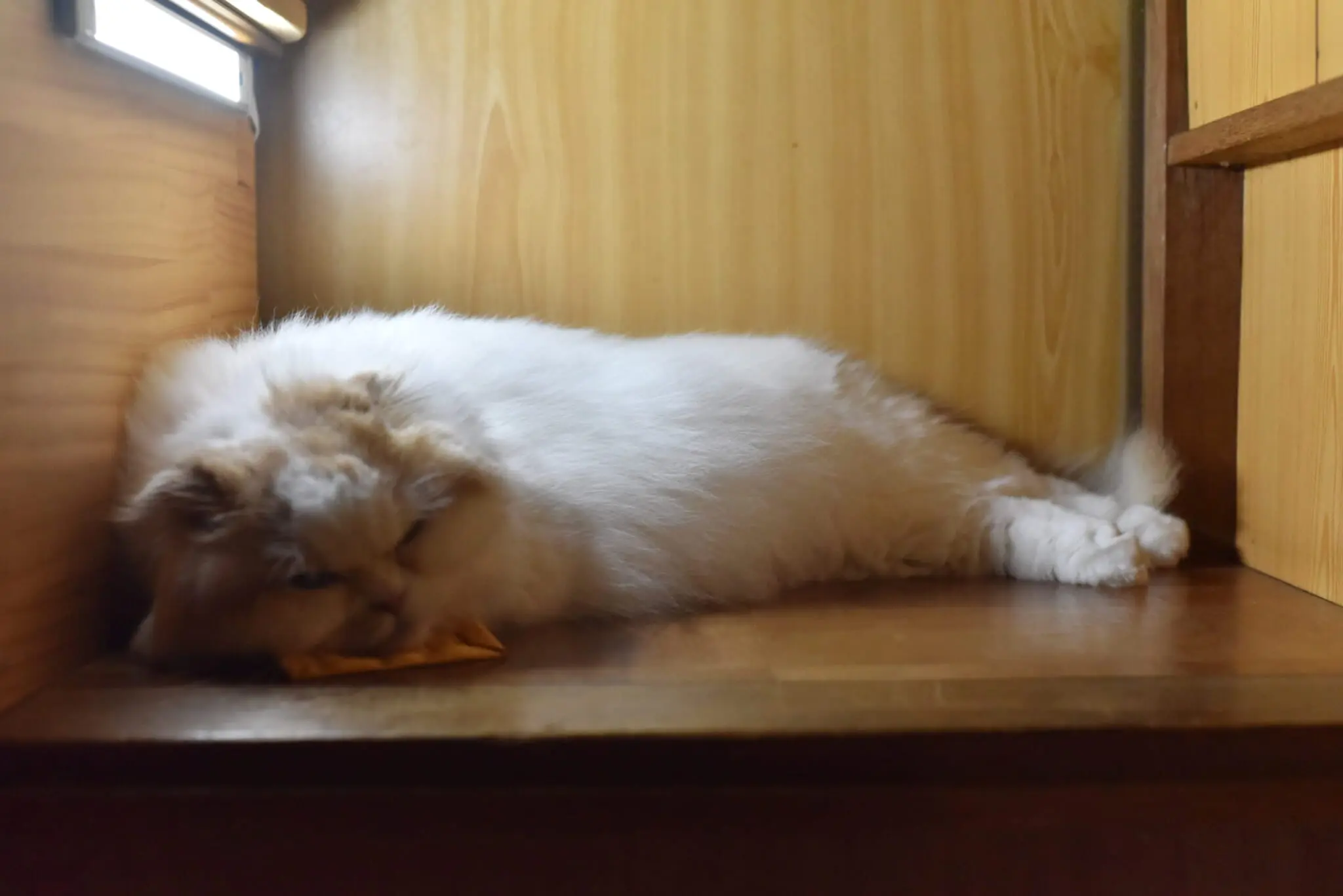 Mayo is a two-year-old mix of Scottish Fold and British Longhair. She loves to nap wherever and whenever possible. The temple’s fifth generation chief cat priest, she approaches incoming visitors with curious eyes seeking affection. If tired, she simply lies down and goes to sleep.