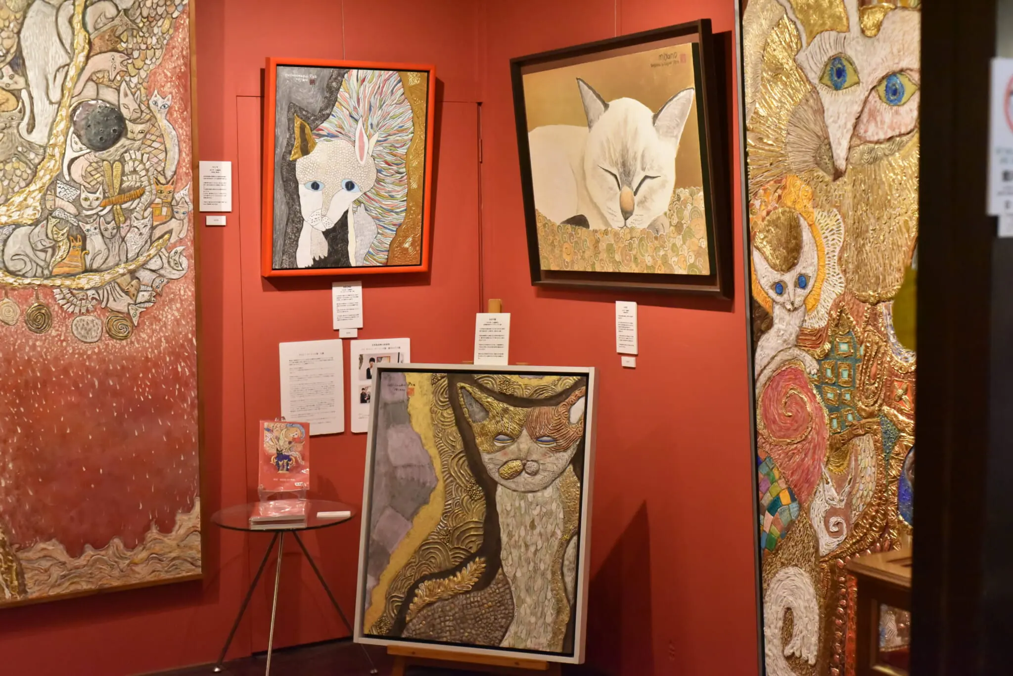 Aside from the living and breathing felines that roam the temple, another highlight of Nyan Nyan-ji is the art (both produced in-house as well as sourced from outside). The museum primarily displays artworks by Miyano, who has been drawing cats since he was 11. His work has garnered many awards and has been showcased in Salon d’automne exhibitions in Paris. Visitors can enjoy his cat-themed artworks and even purchase them. For example, “Cat King,” that won the New Wave Award at the 46th Seisu Exhibition in 2019, is for sale, priced at ¥33 million. It is one of his 16 awarded works, but the only one available for sale.