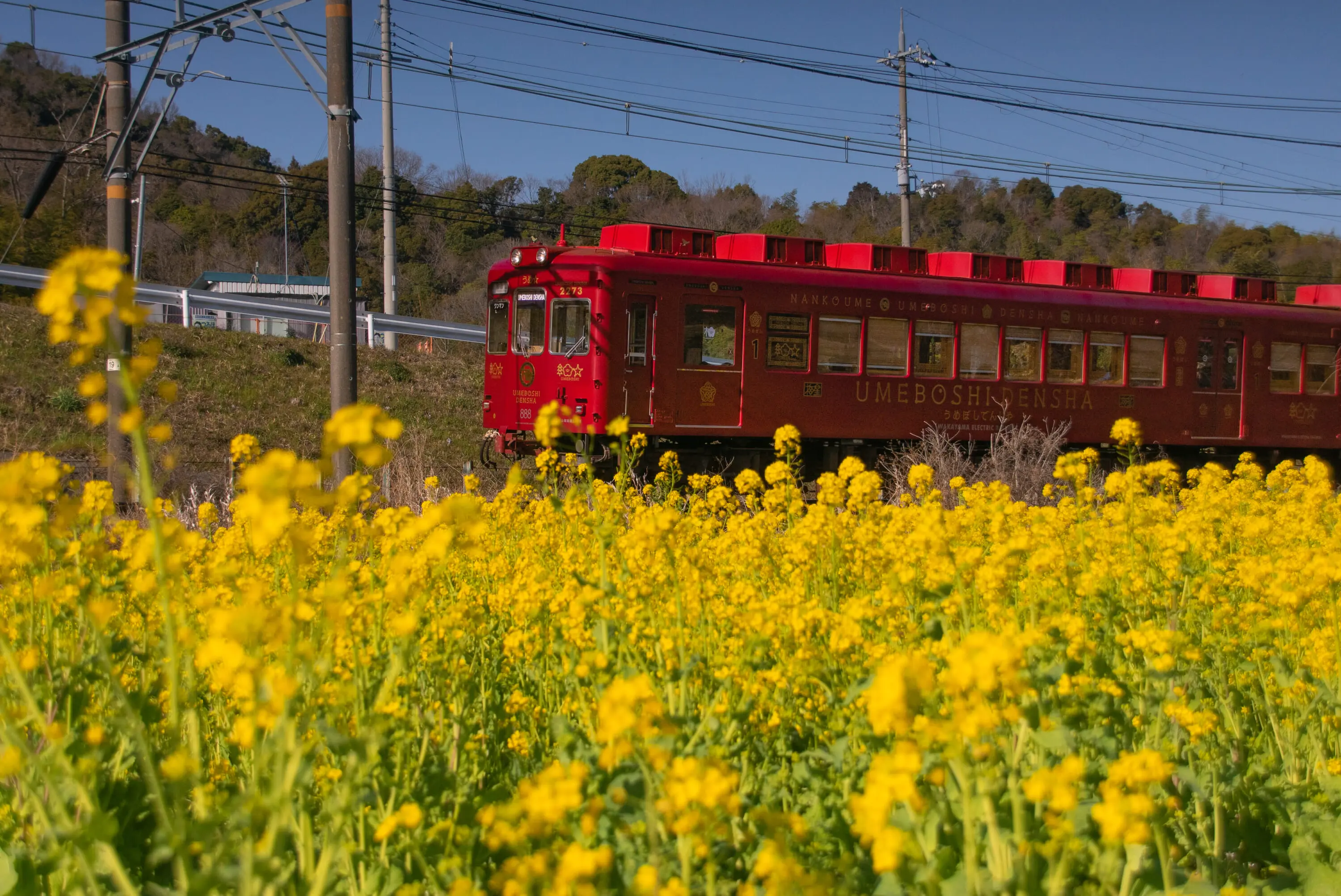 The umeboshi densha in Wakayama going through a field of flowers.