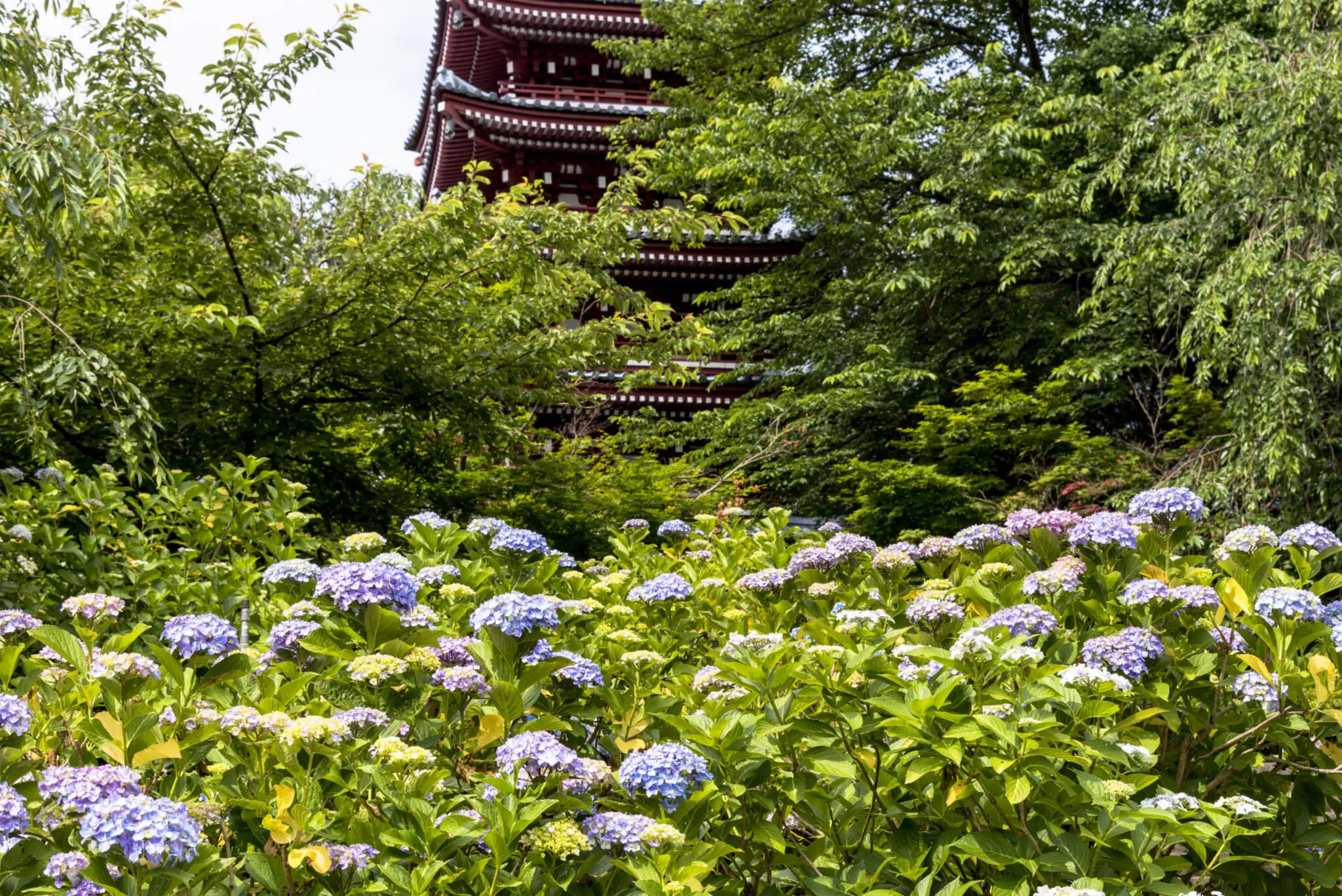 Located in the suburbs of Matsudo city, Chiba, Hondoji Temple grows more than 50,000 hydrangeas. Built in 1277, it is also a great place to visit in the spring time for cherry blossoms, during the rainy season for irises and in autumn for maple trees. Check out the five-story pagoda for the best hydrangea photo spot. It is surrounded by clusters of hydrangeas and is a sight to see from a low angle as the pagoda looks like it’s reaching for the sky. Take a walk along Myorodo, as the path is lined with hydrangeas on both sides.