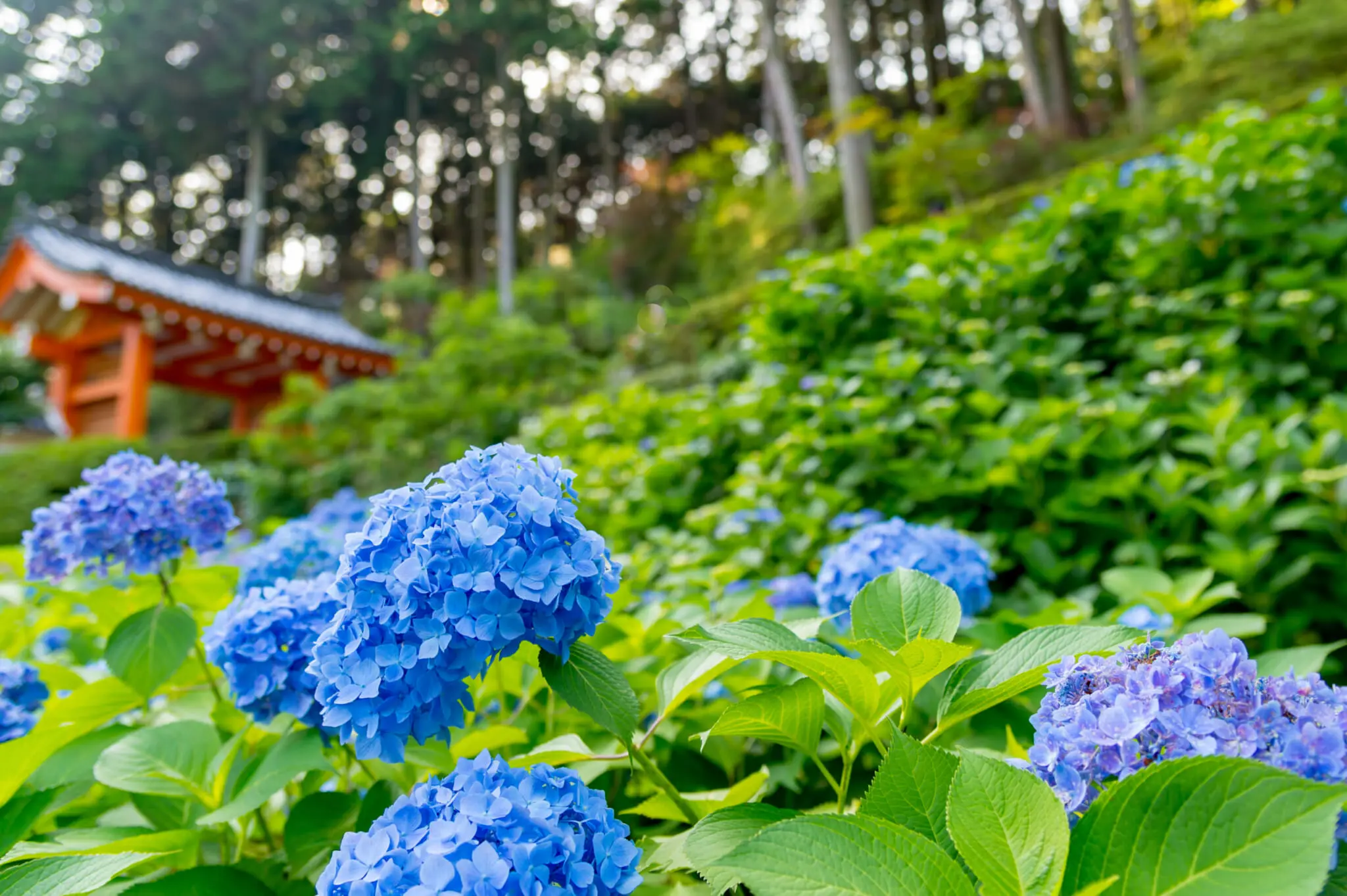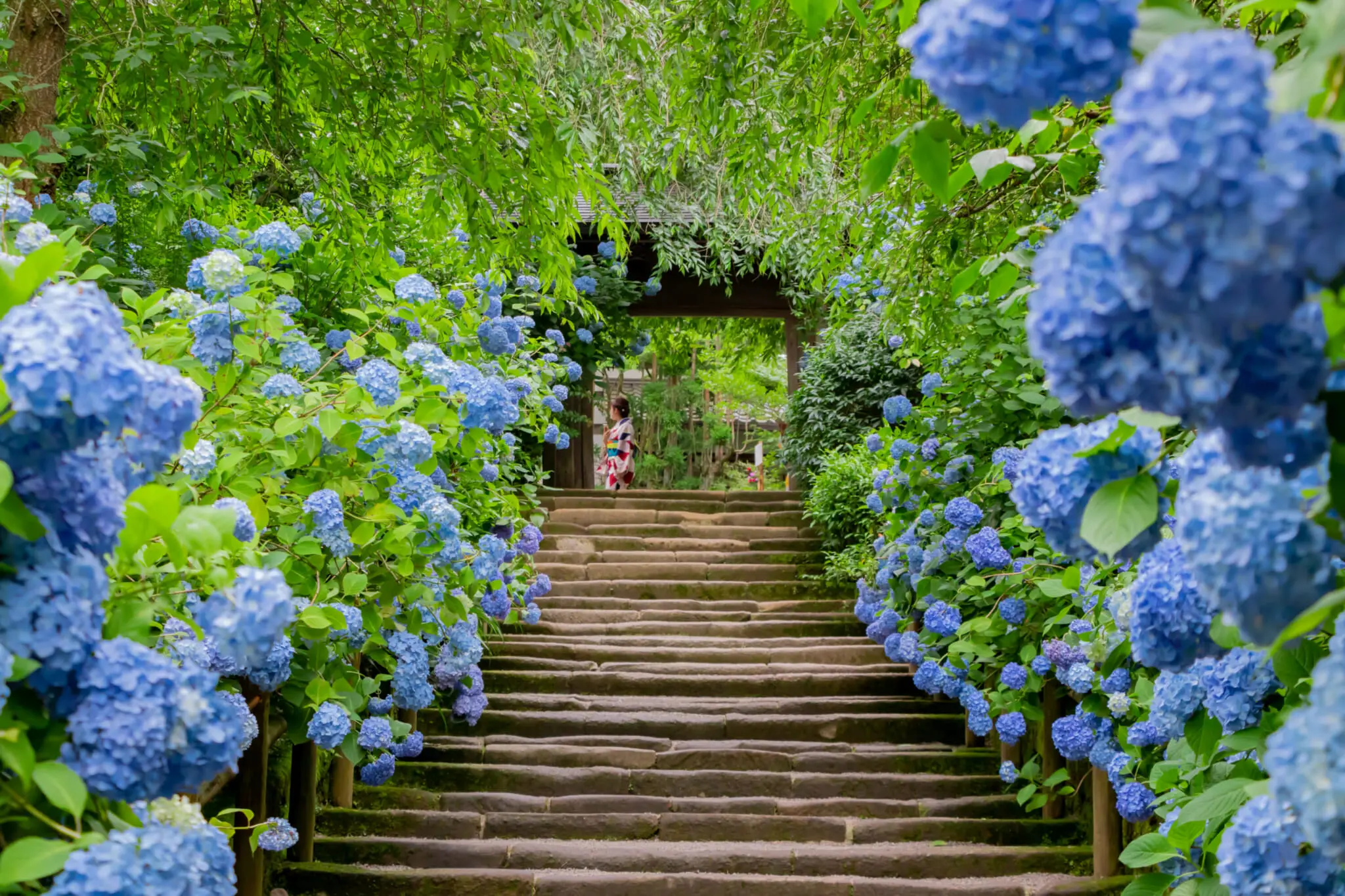 Located in Kamakura, and nicknamed Ajisai Dera, literally hydrangea temple in Japanese, Meigetsuin Temple has a garden filled with over 2,500 hydrangea bushes, boasting a wide range of blue and purple hues. Visitors can take a leisurely stroll through the garden and enjoy the serene atmosphere while admiring the vibrant blooms.