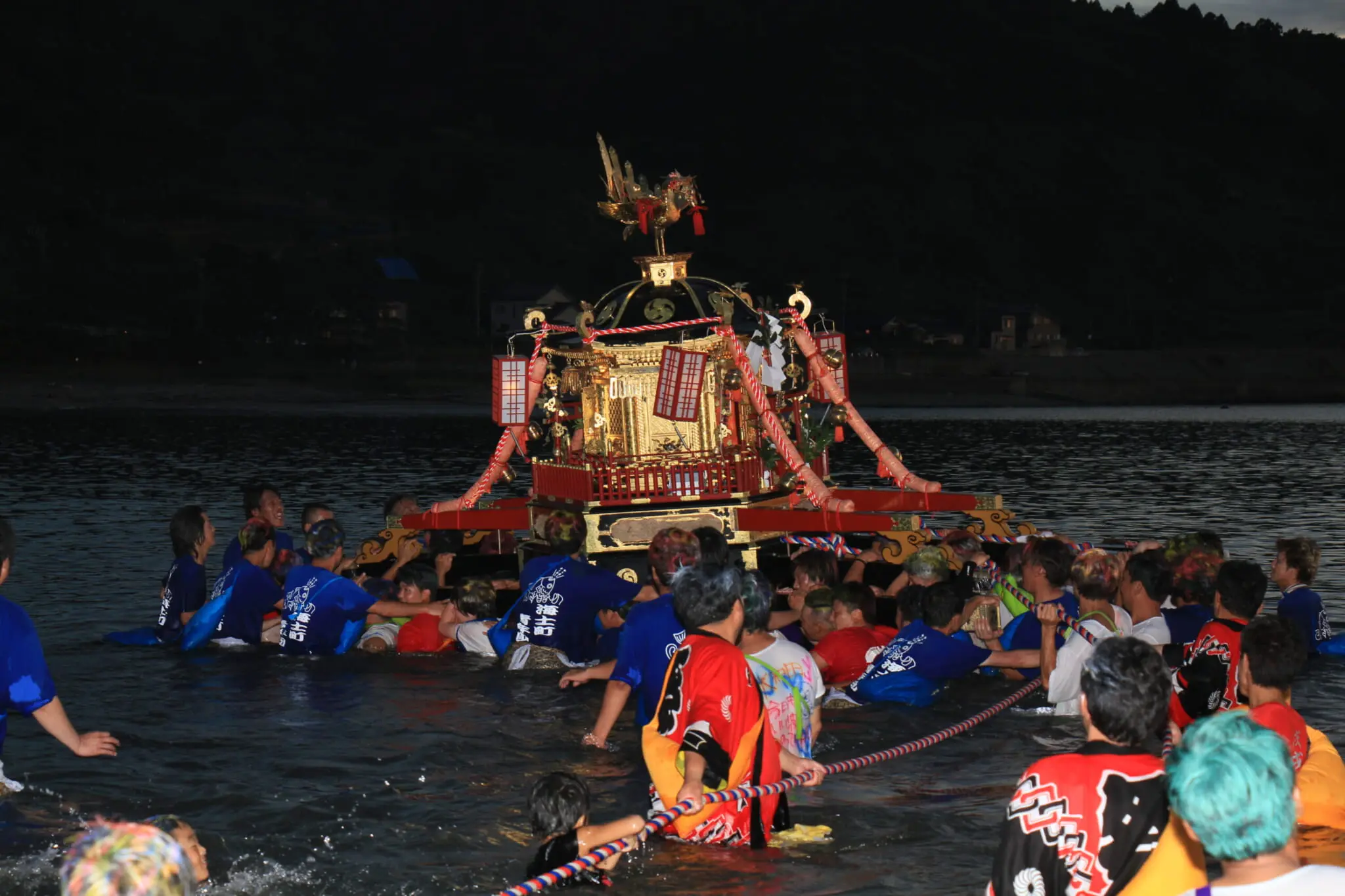 First is the festival of Okutsuhime Shrine, during which young men apply makeup and wear kimonos to appear as women while carrying a portable shrine, known as a mikoshi, down to the nearby ocean. The men then carry the shrine into the water, while children on the beach pull on ropes attached to the shrine, causing it to rock back and forth. While a unique sight, the rocking of the shrine is very important, for it is believed that the longer this continues, the better future fishing catches will be.