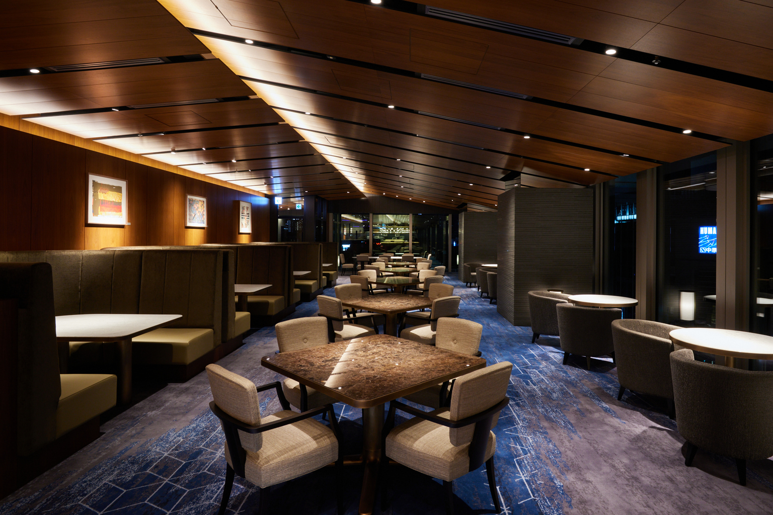 Yoshimoto says the club’s striking walnut, pitched ceiling, basalt feature walls, custom-made carpeting and curated artworks are intended to imbue the space with style and warmth.  “One of the key points around the club is creating an atmosphere of what I call ‘urban sophistication,’” says club member Terry White. Nowhere else is this truer than in the bar area. Set in front of floor-to-ceiling windows, the bar’s wood-and-brass aesthetic, complete with pendant lights, footrails and an illuminated central liquor display, is sure to catch more than a few eyes. “We want this to be the wow factor,” Yoshimoto says.