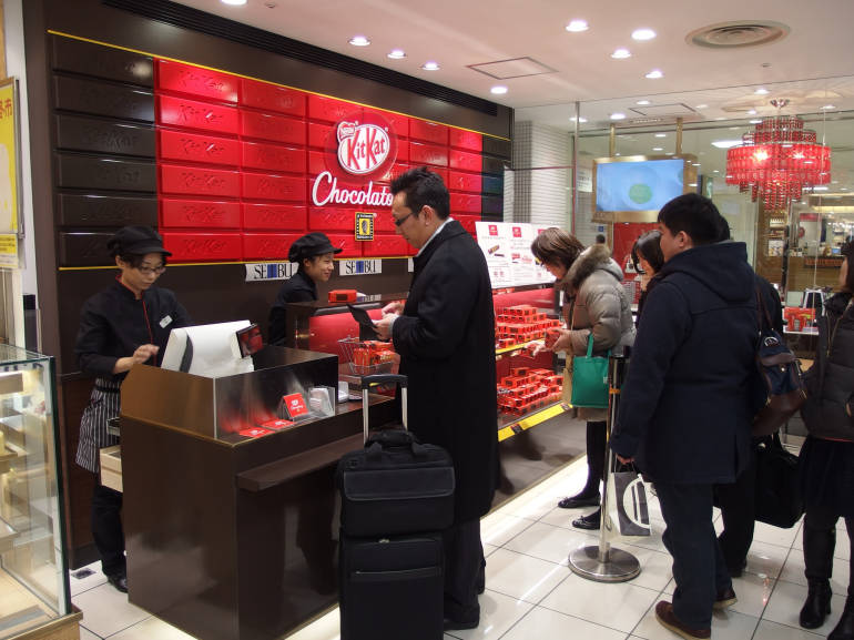 Some of Akihabara’s duty-free shops like Laox sell Kit Kats in different flavors. Also, head to Odaiba, where there are 2 souvenir shops that sell wacky Kit Kat flavors: Le Edo on the first floor of Aqua City, and Hikari Yokocho. Both are a short walk from Tokyo Teleport Station. Let me give you an idea of the flavors I saw in Odaiba last time: soy sauce, wasabi, rum raisin, strawberry cheesecake, Kobe pudding, and chili. But if you think that’s already a lot, wait till you check out First Avenue Tokyo Station, which has an entire zone devoted to sweets, and probably the most diverse selection of Kit Kat flavors in Tokyo. Since the sweets in these shops are primarily sold as souvenirs, the Kit Kats come in boxes that usually cost 800 yen onwards.