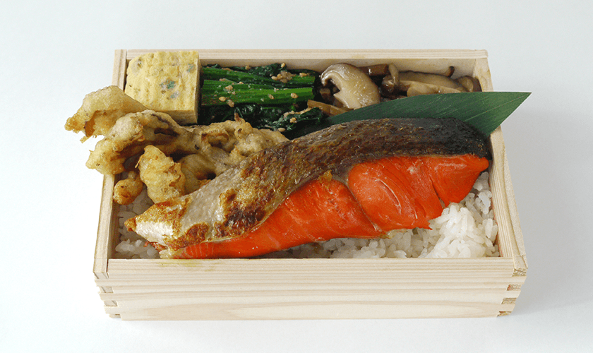 Visit the castle town of Murakami in winter and you’ll be met with rows of salmon hanging from rooftops across town. The area’s specialty, shiobiki dried salmon, finds its place in an aged shiobiki dried salmon bento in this stand’s lunch menu, alongside Murakami’s other mainstay, Murakami beef. The beef bento is served on a bed of soft and chewy koshihikari rice from Iwafune. For dinner, try beef-on-a-stick, or a shiobiki salmon packet cooked in oil with shiitake mushrooms. For those with a sweet tooth, there’s a soft serve ice cream mixed with green tea powder and garnished with nuts, honey and a dash of salt.