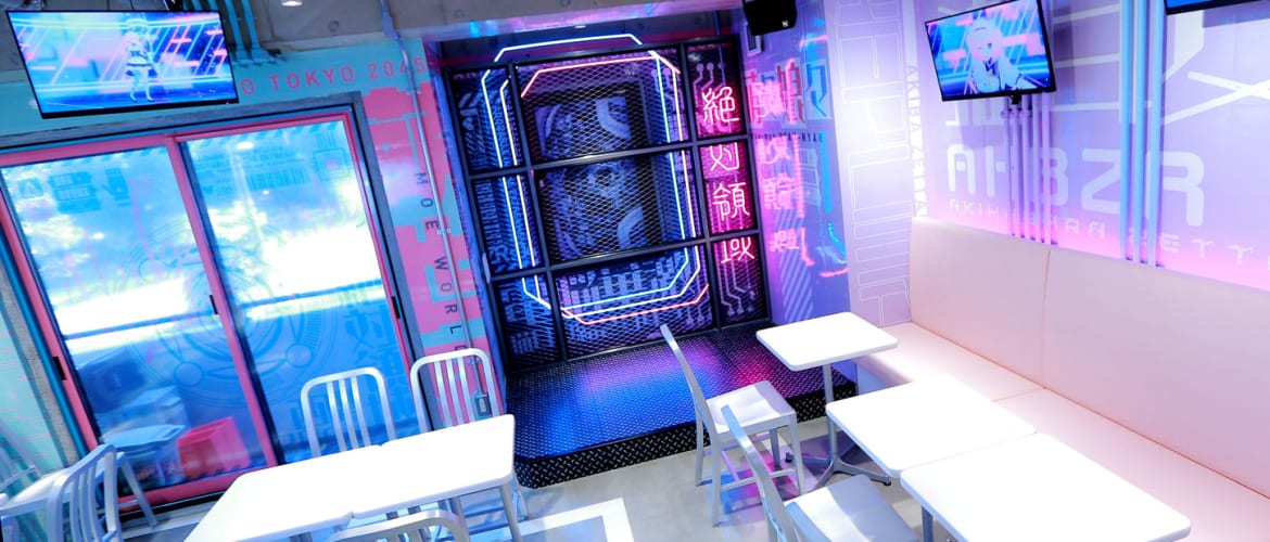 Akiba Zettai Ryoiki A.D. 2045, which styles itself as the world’s first cyber maid café, opened its doors in March 2019 in Akihabara, Tokyo’s home ground for concept restaurants where waitresses dress as maids and treat customers like masters supping in their own home. The theme of the café is the not-too-distant future year of 2045 and the maids aren’t maids but, in fact, “cat-shaped pet robots from the future.” The cafe’s food menu is surprisingly ordinary considering the setting. It’s mostly omelets, desserts and fried foods on rice. You can also order cocktail sets that come with a live performance by one of the maids doing their best idol impressions on the small, brightly lit corner stage.