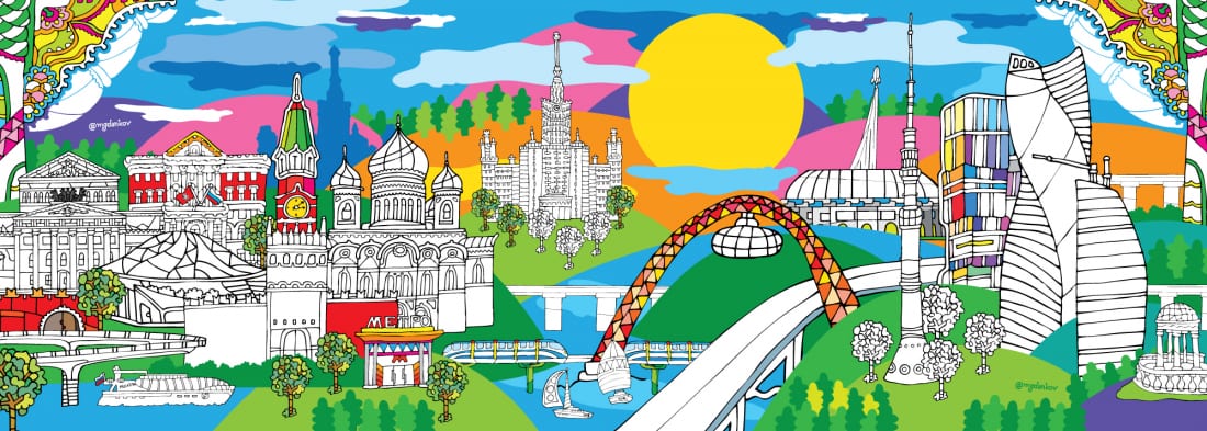 City residents and guests are invited to participate in coloring and creating the vivid and remarkable art object, filling the artist’s black and white drawing with color. The artistic walls (2.5x7m) resemble huge coloring books. Artistic artworks inspired by cityscapes of Moscow and Tokyo appear on both sides.