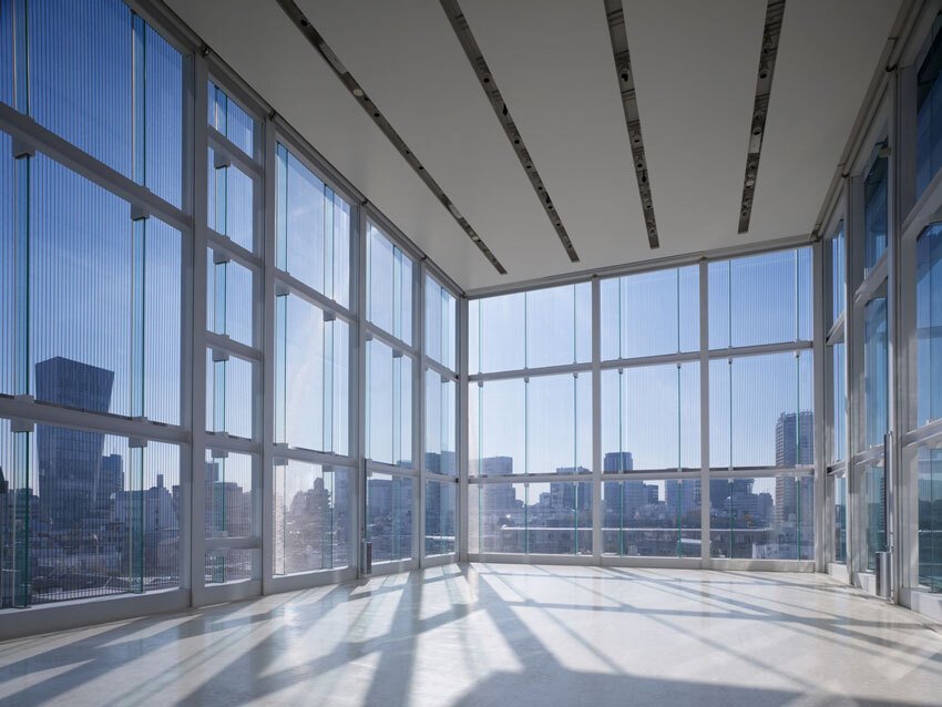 Consisting of fifteen floors with a total area of 6,000 square meters, the building also contains a rooftop garden, the art gallery Le Forum on the eighth floor and a reservation-only mini-theater called Le Studio on the tenth floor. The exhibition space is illuminated by a soft light that filters through the glass blocks and emphasizes the high ceiling, making it a perfect venue for visual installations. There is also a small mezzanine floor to showcase a corridor of exhibits. In conjunction with the Hermès Foundation, a non-profit organization established in Paris in 2008, Le Forum supports creative projects related to art, technology, environment, education and has hosted over fifty exhibitions since its opening.