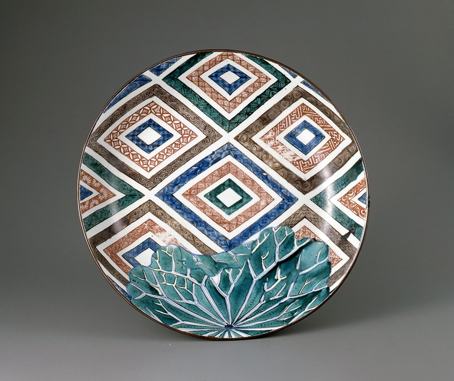 Dish with Design of Lotus Leaf and Geometric Pattern, Overglaze Enamels, Ko-Kutani Style, Japan, Middle 17th Century, Idemitsu Museum of Arts