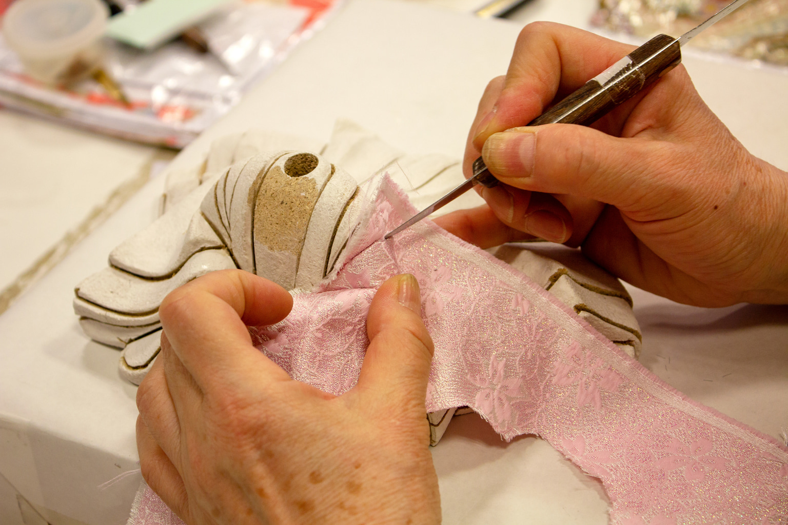 Kimekomi is a traditional technique that involves carving narrow grooves not much wider than a fingernail onto a surface such as soft wood or smooth foam, and then tucking fabric into these grooves. It can be used for simple ornaments and decorations, but perhaps the most popular artworks in the genre are kimekomi ningyo (dolls), in which case the technique is intricately employed to make the dolls’ clothes look true to life. The technique originated about 260 years ago, using leftover clothes from Shinto shrines and festivals. Most kimekomi dolls are seasonal – hina dolls are displayed in March, and gogatsu dolls (the samurai helmets for boys) are common sights at homes in May. We checked in with Toshimitsu Kakinuma, a second-generation kimekomi craftsman of the company Kakinuma Ningyo, to find out more.