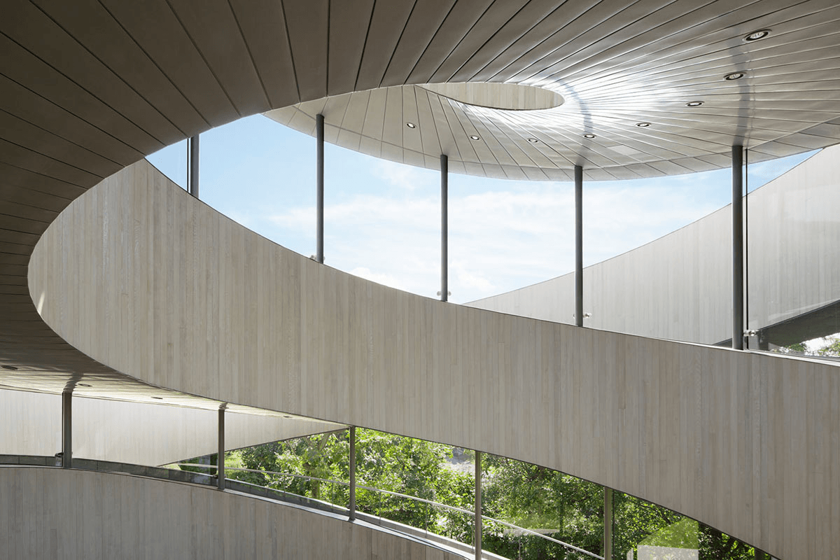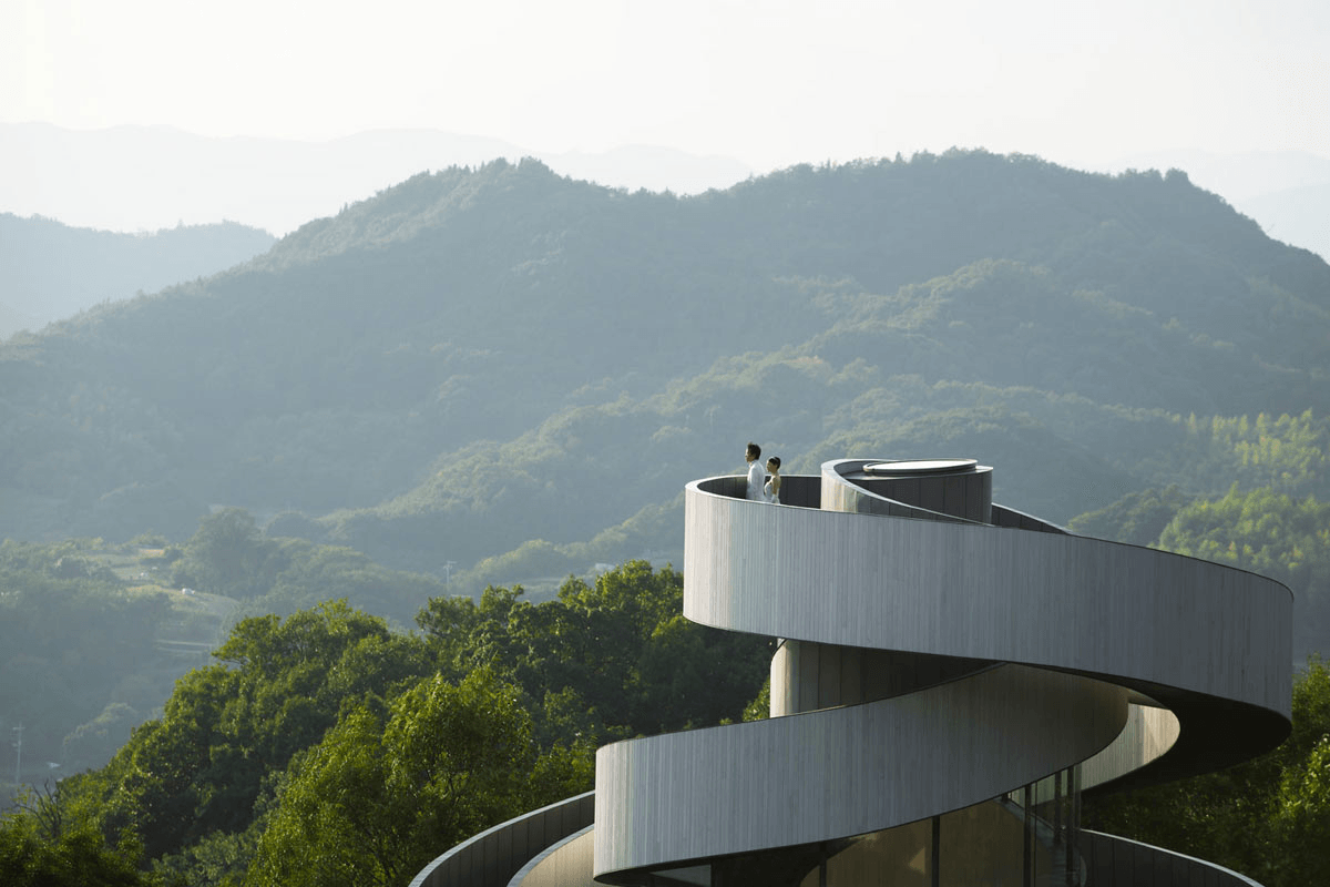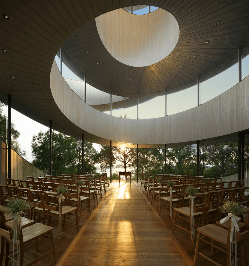 Built in 2013 and designed by Hiroshi Nakamura from NAP Architects, the “Ribbon Chapel” is a part of the Bella Vista Spa and Marina resort in Onomichi. As Nakamura explains, the distinctive structure, which features two “ribbon” staircases that meet at the the top of the 15.4 meter (50.5 foot) structure, is a metaphor for the many wedding ceremonies that have been held there since it was built: “Just as two lives go through twists and turns before uniting as one, the two spirals seamlessly connect at their 15.4m summit to form a single ribbon.”