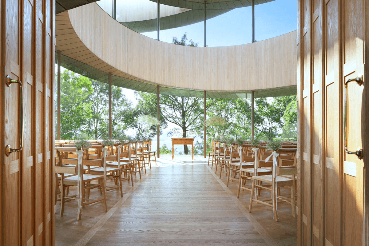As the architect adds, the double staircase also helps to increase the stability of the chapel – something that is, perhaps, telling in its own right. The central area provides seating for up to 80 guests at the wedding ceremony, who can see the bride and groom as they proceed up the staircases, meet at the top of the chapel, and then descend as a couple. (We’re also hoping that at least a few weddings have featured the Stevie Wonder tune that came to our mind when we heard about this place…)