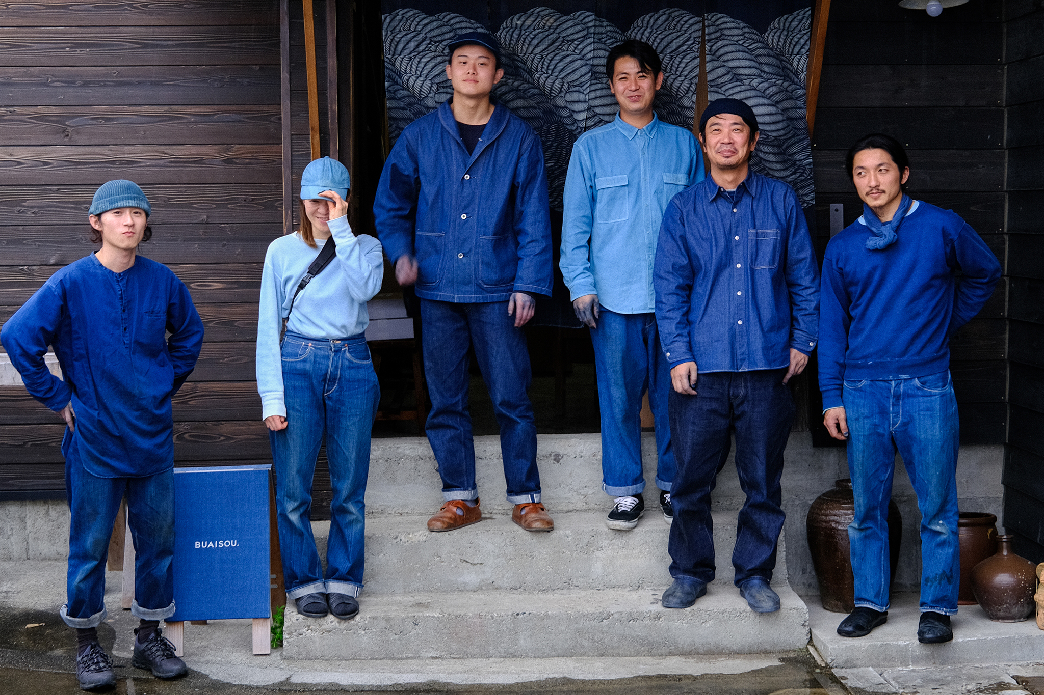 Typically, dyers and indigo makers work separately: Clothing brands which specialize in indigo products will purchase dye from a dye-maker, who creates the indigo either synthetically or from the plant. Buaisou, conversely, does everything on-site. They have their own indigo field, where they cultivate the plant from seed, then ferment its leaves into the liquid for dyeing, known as eki in Japanese. They dye all their pieces by hand, be that artwork or clothing; they’re best known for their denim and the instructional workshops they host about the traditional art they practice.
