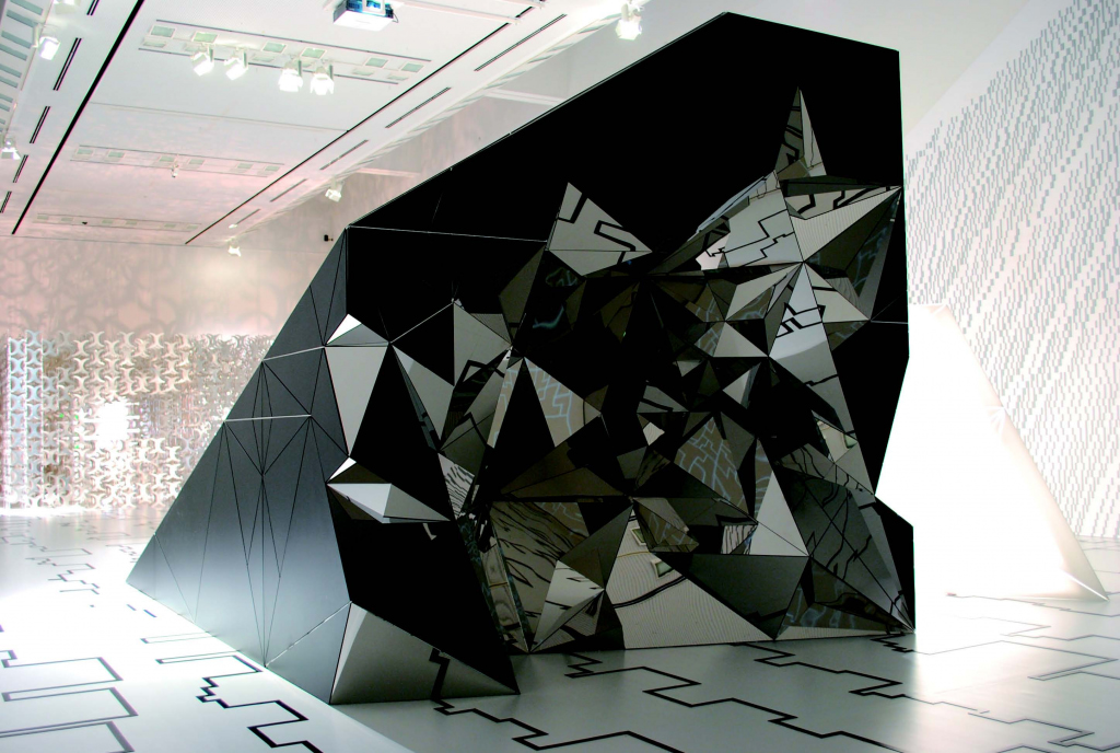 The Danzer work consists of two abstract ‘stones’ in a waterless ‘fractal river’ which pours down from a projected waterfall of golden-ratio shapes. The stones themselves are made up of four repeated tetrahedrons of varying sizes, which fit together like a puzzle. Danzer may be a little obtuse for the non-mathematically inclined, but is still impressive in its complexity, challenging the viewer to see it as more than just a hollow skin, but as a collection of interconnected shapes, just as any stone is an arrangement of particles as well.