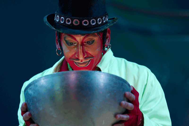 It all starts with The Crystal Man. Glittering and curled up, he drops slowly from the ceiling. The 4,000 mirror pieces that make up his costume sparkle in the spotlight as he dips towards the stage. His commanding presence, hovering over the giant turtle carapace stage set, summons the “frog people” to rise from their slumber, bringing a spark into the show. With a beat of the drums, the fire catches, and life begins.