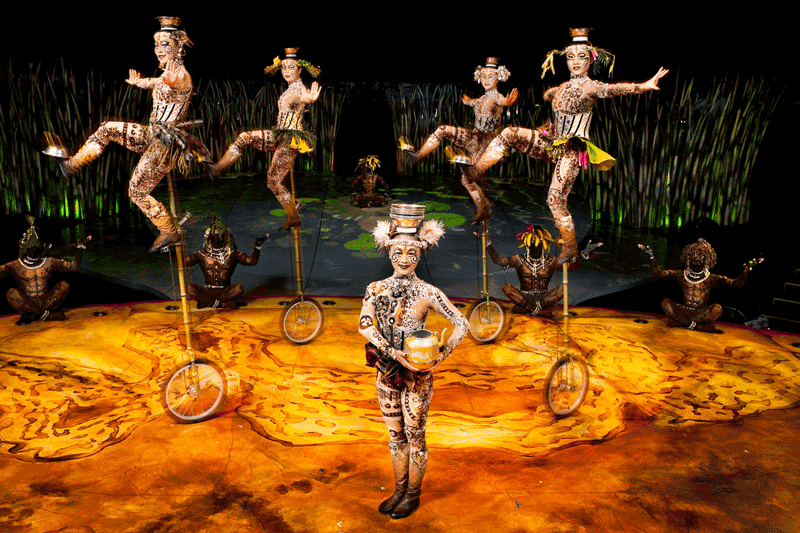 Each of the dozen acts embodies a particular time and place, and highlights a different kind of performance skill. As the show progresses, each act seems to top the one before, continuing to expand the boundary of human ability, right up to the climax of the two-hour journey through the history of humankind. The breathtaking performances by the cast, including musicians, are all “disciplines you’ve never seen on a Cirque stage before,” proclaims publicist Francis Jalbert.