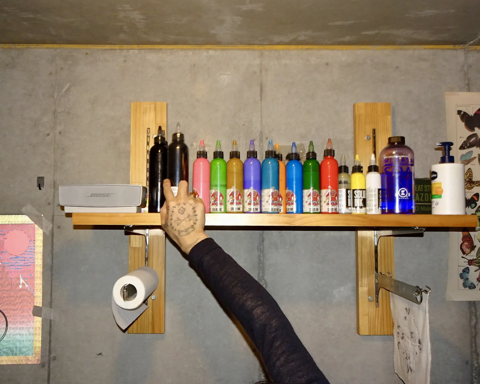 This is Flat Tattoo Room, Keisuke Hirata’s studio, where doodles find permanence on living skin. Here, he expertly merges playful designs with traditional stick-and-poke techniques, earning him acclaim as a rising tattoo artist in Tokyo.