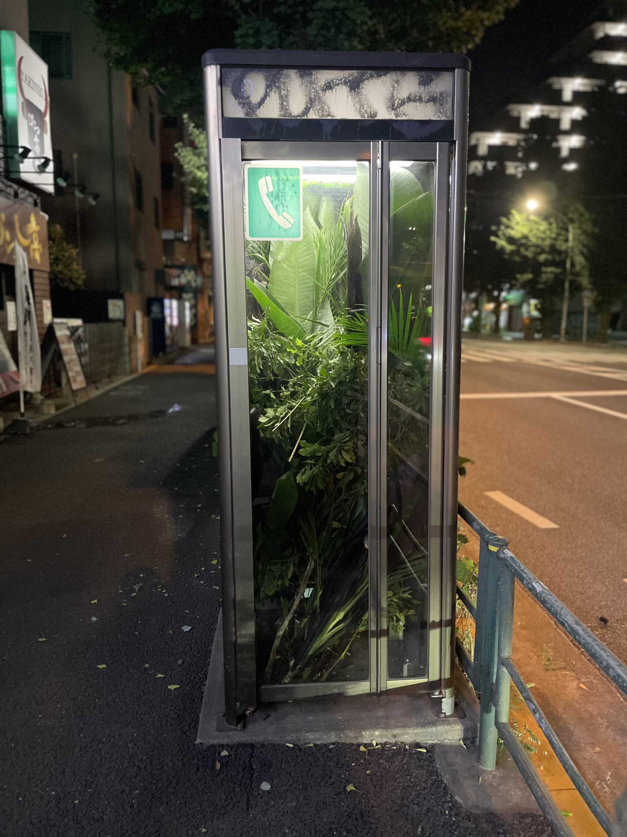 Shimura’s works often aren’t polished in the way many flower arrangements are. He’ll post Instagram photos of phone booths and metal railings overrun by plants, with the single caption, “flower bomb.” For many of his works, Shimura purposefully leaves roots and branches intact, revealing the plant’s entire structure and giving the illusion that it’s always been there.